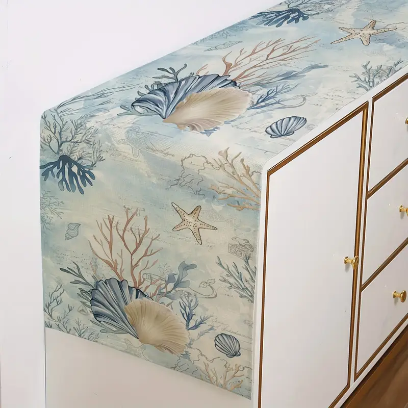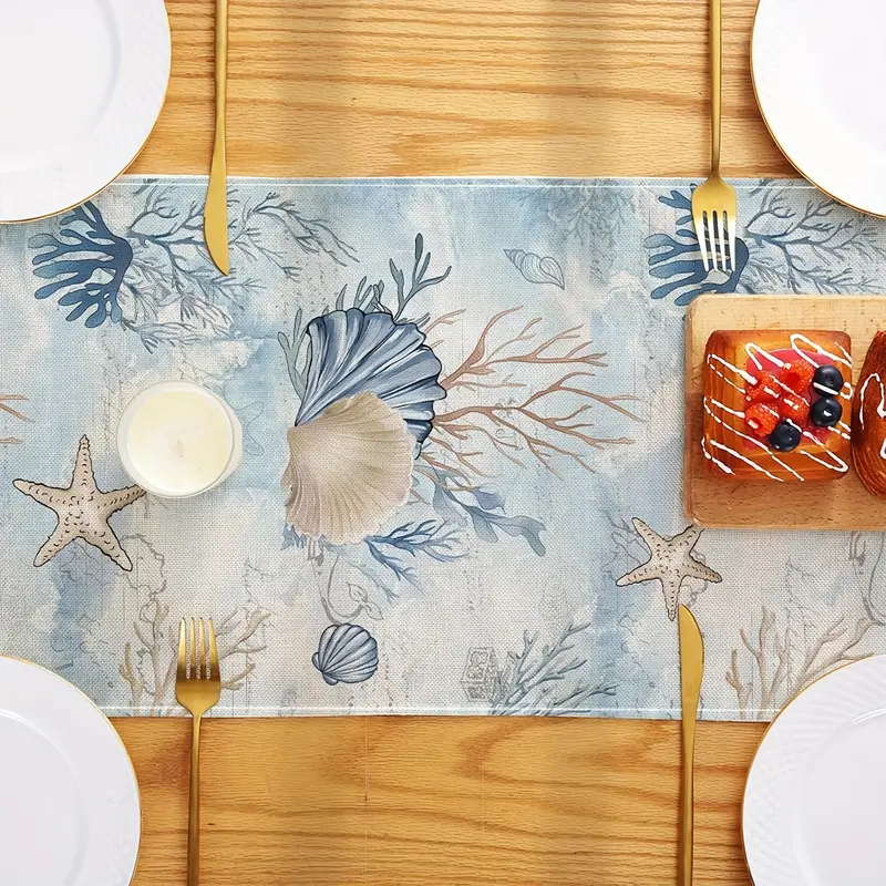 - Linen Sea Shell Starfish Table Runners - Coastal Decor - Ocean Sea Life Design