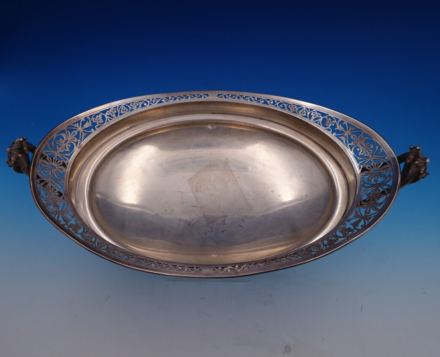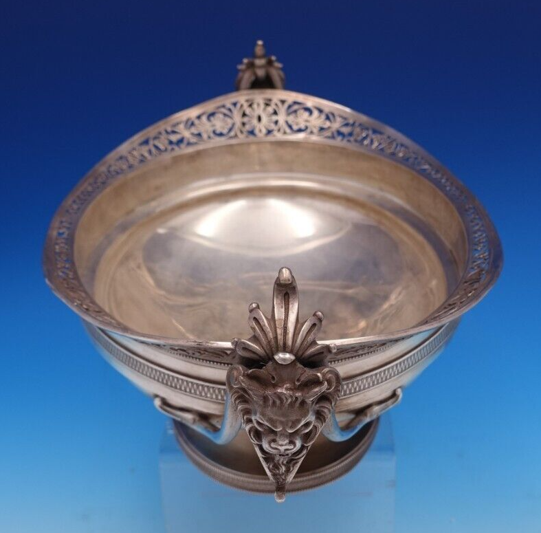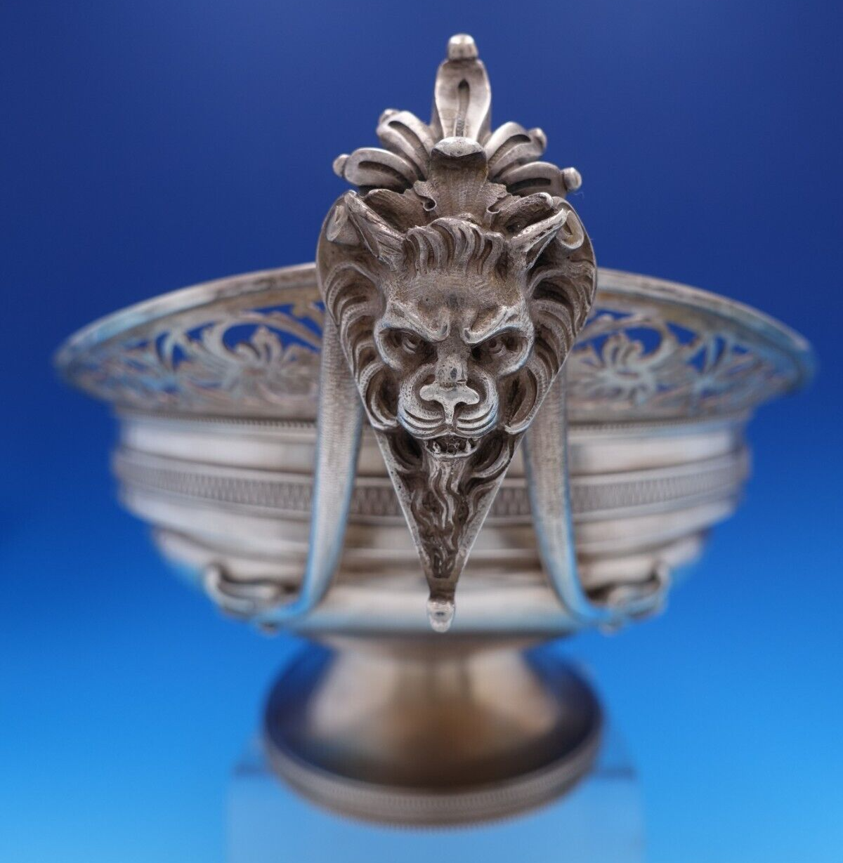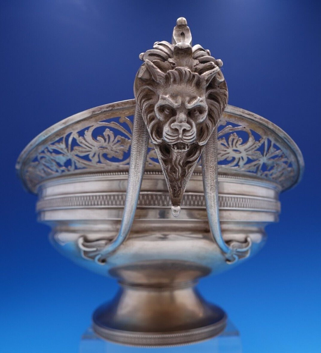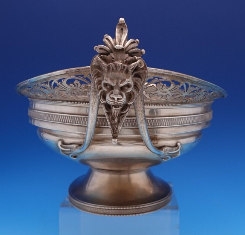 Stunning Lion by Gorham sterling silver centerpiece marked #130, circa 1870. This piece features figural lion finials and has a pierced and beaded rim.