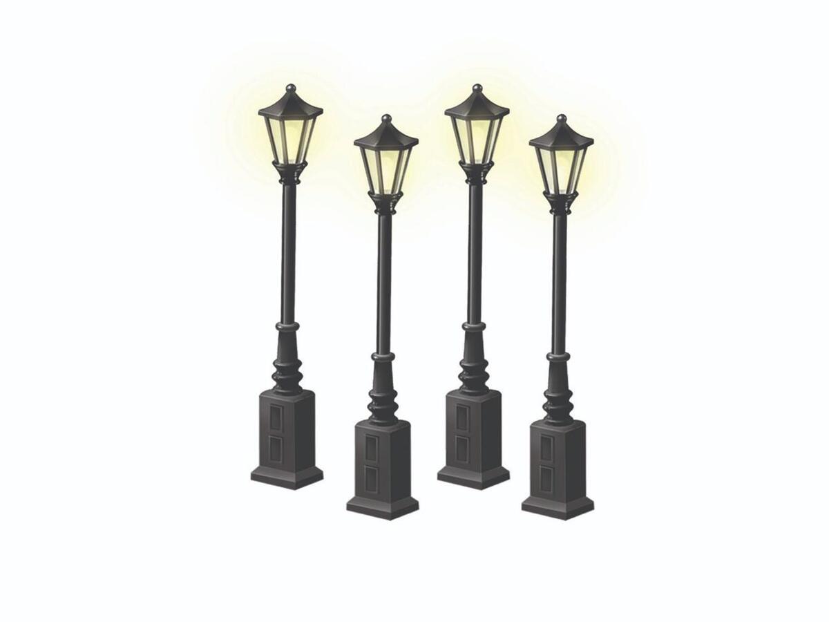 The Lionelville Street Lamps are the perfect way to illuminate the quaint streets on your layout. These lamps feature removable bases that can press into holes in your layout for a realistic appearance.