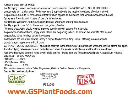 Product description: Liquid Kelp from GS Plant Foods is among the highest quality seaweed products you can buy, derived from the Ascophyllum Nodosum seaweed from Norway, which has been proven to be the most effective at providing the desired results. Liquid Kelp is a natural plant food that provides a range of benefits for plant health and growth. One of nature's miracle plant foods. Use GS Plant Foods Liquid Kelp along with other fertilizers, or by itself. It pairs especially well with a high quality Liquid Fish fertilizer such as GS Plant Foods Organic Liquid Fish. Use on all plants, seedlings, fruit trees, houseplants as a regular healthful maintenance program. Benefits of Liquid Kelp: -Improves abiotic stress tolerance. -Helps microbial populations. -Enhances conversion of applied fertilizers. -Enhances conditions for better plant establishment- Improves Overall plant nutrition. Optimizes soil conditions for greater root mass. All natural, you really can't overuse this product, and your plants will love you for it. GS Plant Foods. High Performance Products for your Plants.