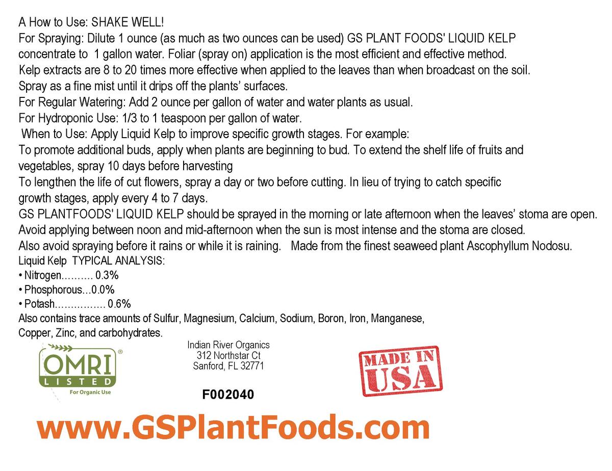 Liquid Kelp from GS Plant Foods is among the highest quality seaweed products you can buy, derived from the Ascophyllum Nodosum seaweed from Norway, which has been proven to be the most effective at providing the desired results. Liquid Kelp is a natural plant food that provides a range of benefits for plant health and growth. One of nature's miracle plant foods. Use GS Plant Foods Liquid Kelp along with other fertilizers, or by itself. It pairs especially well with a high quality Liquid Fish fertilizer such as GS Plant Foods Organic Liquid Fish. Use on all plants, seedlings, fruit trees, houseplants as a regular healthful maintenance program. Benefits of Liquid Kelp: -Improves abiotic stress tolerance. -Helps microbial populations. -Enhances conversion of applied fertilizers. -Enhances conditions for better plant establishment- Improves Overall plant nutrition. Optimizes soil conditions for greater root mass. All natural, you really can't overuse this product, and your plants will love you for it. GS Plant Foods. High Performance Products for your Plants.