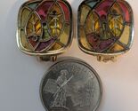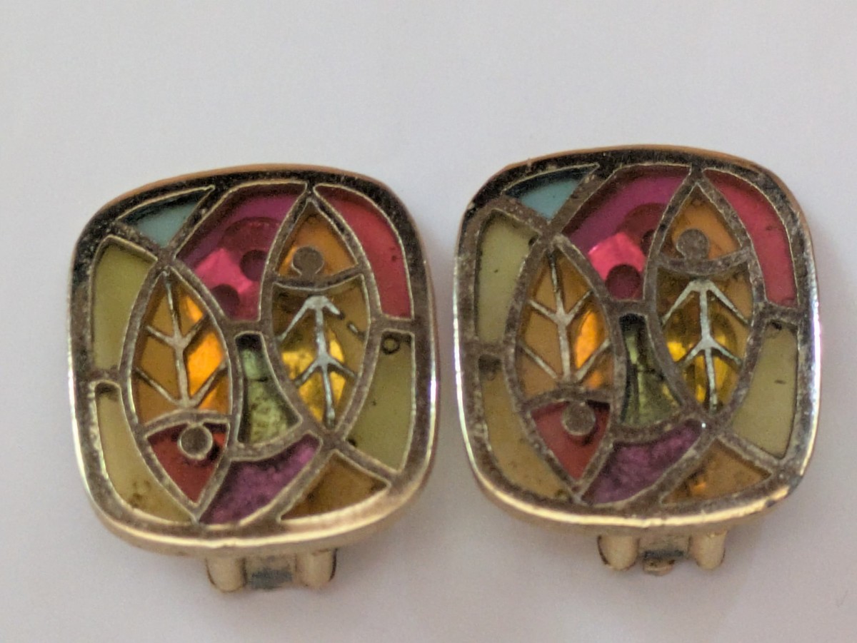 Les boucles d'oreilles a clip carrees en vitrail multicolore Lisner Plique A Jour sont des boucles d'oreilles vintage signees fabriquees aux Etats-Unis. Ces boucles d'oreilles dorees presentent un style calin avec une fermeture a clip carree. Le design en vitrail multicolore ajoute une touche unique et accrocheuse a n'importe quelle tenue. Parfait pour ceux qui apprecient les bijoux originaux et vintage.