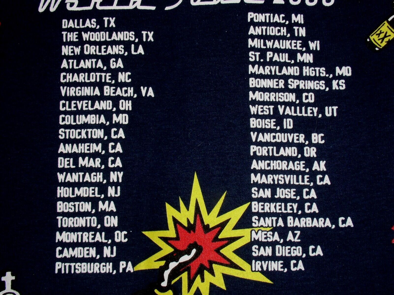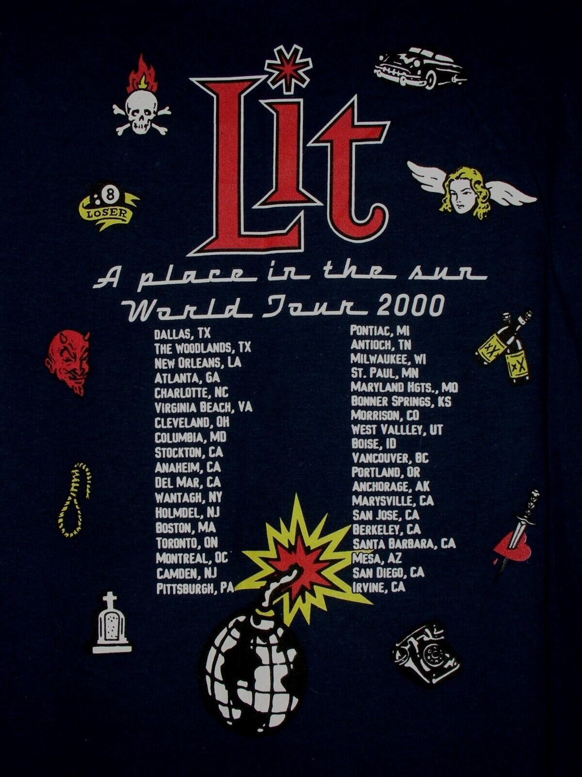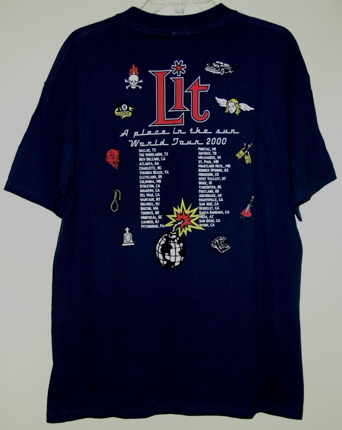 This is a vintage concert tour t shirt entitled, "Lit A Place In The Sun World Tour 2000". U.S.A. cities on the back makes this all the nicer. Tag reads: Optima Cotton Wear Heavy. Color is Navy Blue. A terrific item for the fan or collector.
