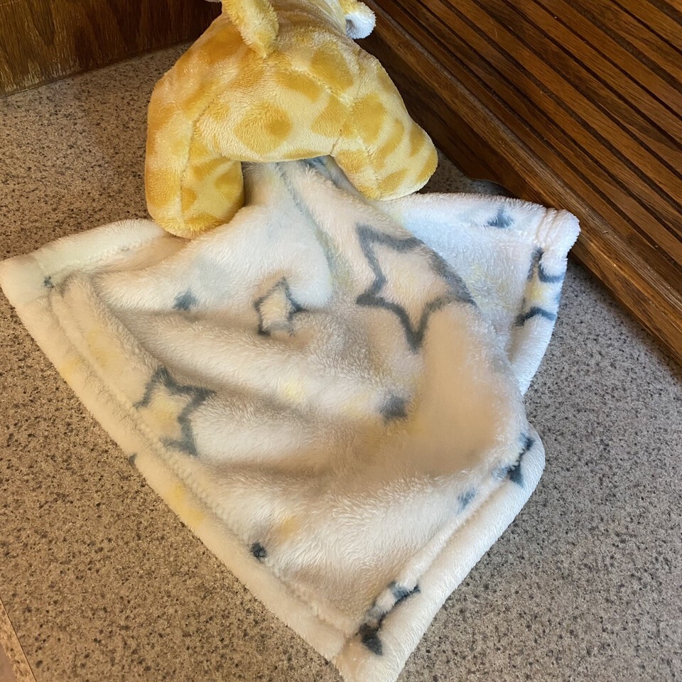 Little Beginnings Giraffe 7" Plush Security Blanket Lovey Baby Yellow Blue Star. CLOTHING AND FABRIC ITEMS: All clothing and fabric items have been steam cleaned and/or washed per standards.