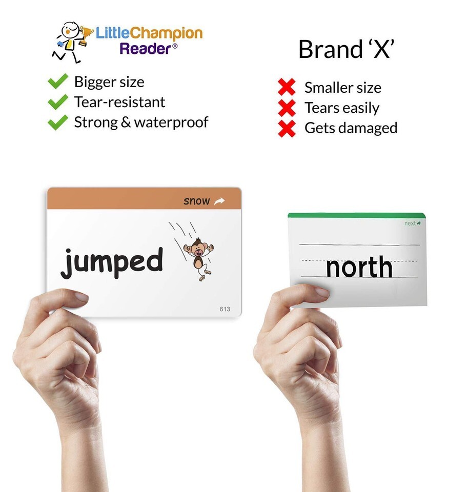 Sight Words, also called high-frequency words, constitute up to 75 percent of children's elementary school text. Sight words typically don't follow phonetic rules and therefore are too tricky for young readers to decode on their own. Memorization of sight words leads to automatic recognition of a word even before attempting to read, allowing the child a chance to concentrate on comprehension without having to spend time stopping and decoding every single word. Instant recognition of sight words leads to increased reading confidence, faster reading speed and better comprehension skills. This 10-pack set from Little Champion Reader teaches all 1,000 sight words extracted from Dolch Fry Word List. Using sight word flashcards is the simplest and fastest way to memorize those sight word lists!