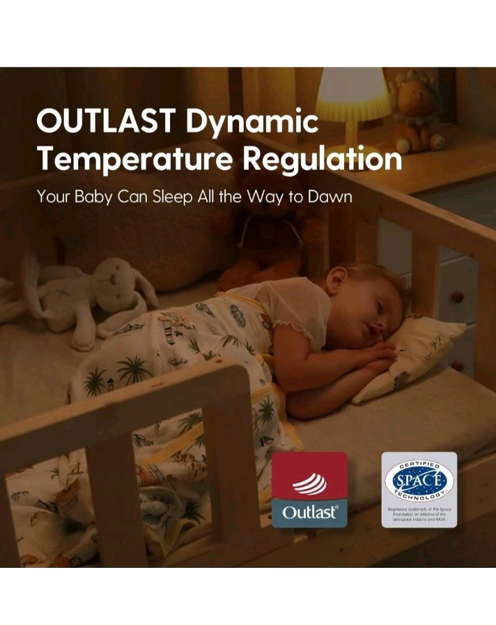 ?OUTLAST Temperature Regulation?Our thermostatic Sleeping Bag adopts OUTLAST Thermostatic Technology, which can adjust the temperature within a certain temperature range. OUTLAST thermo-material proactively stores and releases heat to ensure a comfortable sleep throughout the night without overheating or chilling, offering your sweetie pie an unparalleled comfortable sleeping environment.