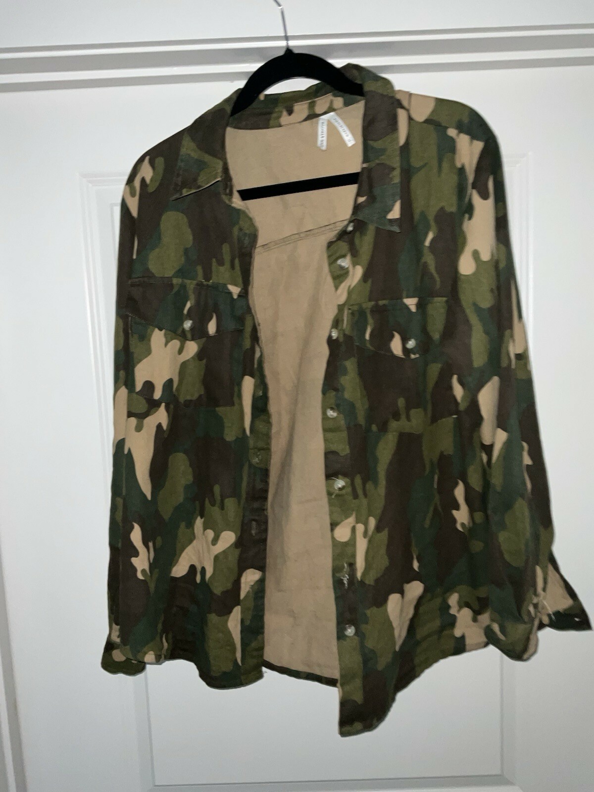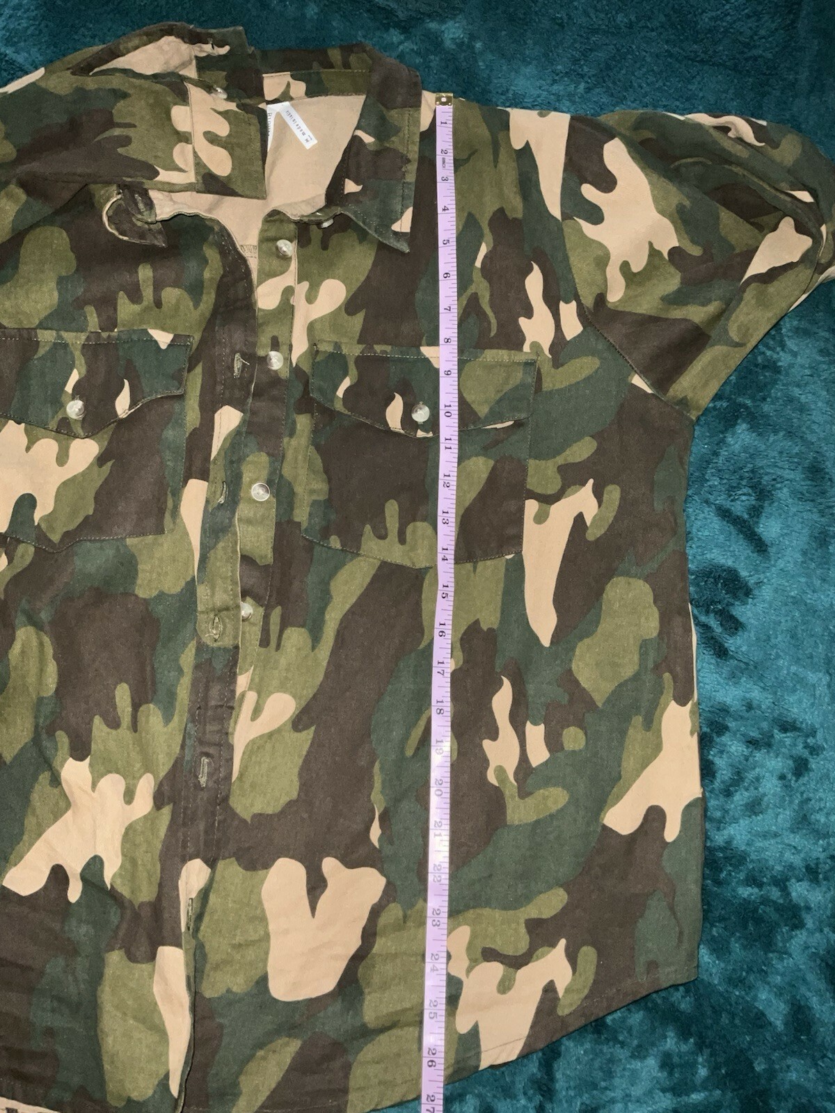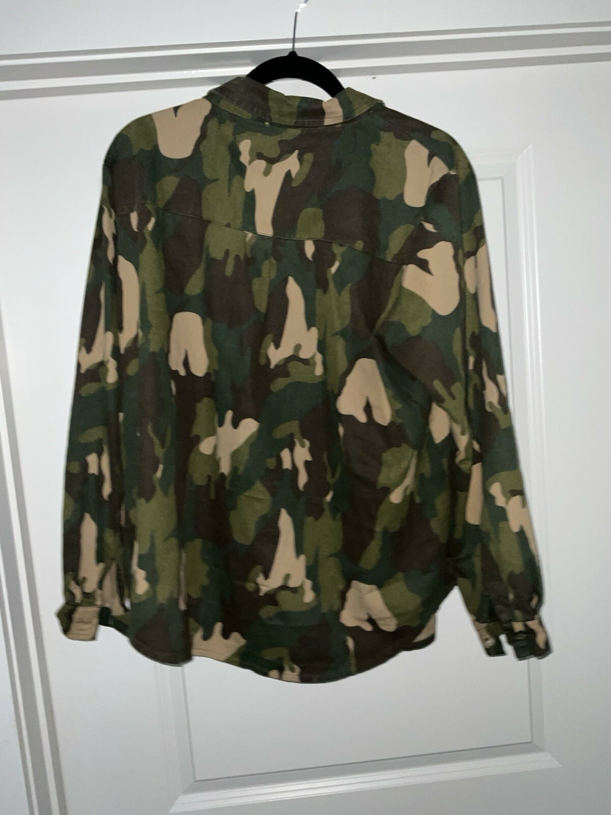 The Live 4 Truth Green 100% Army Print Button Front Long Sleeve Shirt in size XL is a stylish and comfortable top for women. With a camouflage pattern featuring a military theme, this oversized shirt is perfect for those who want to make a statement with their fashion. The long sleeves and button-up front add a touch of sophistication, making it a versatile piece that can be dressed up or down. Ideal for casual wear or as a trendy wardrobe staple, this shirt is sure to stand out in any outfit. **1 button missing**