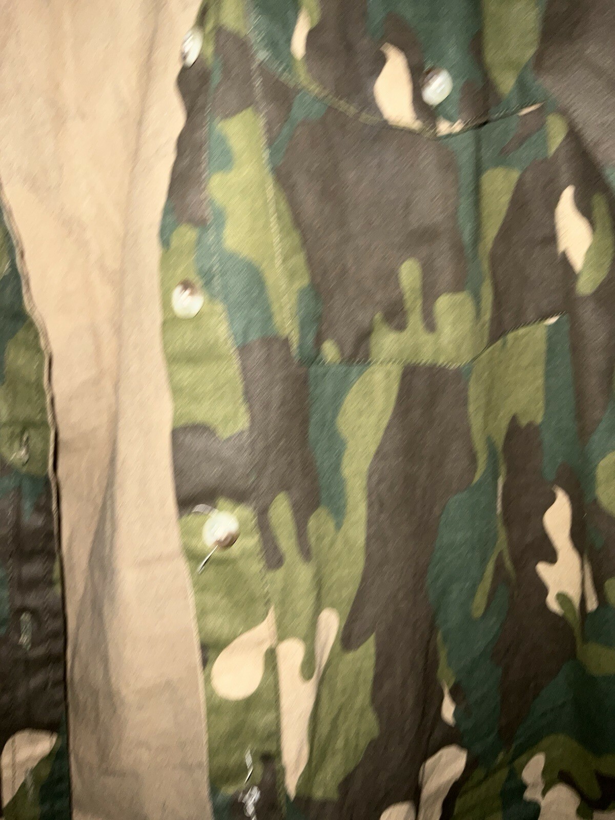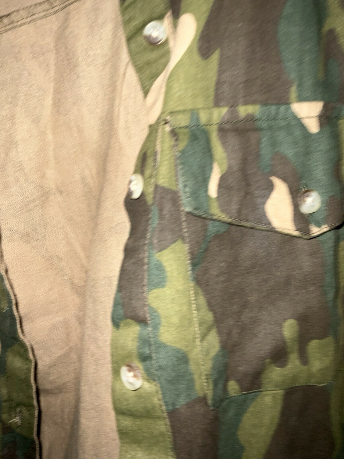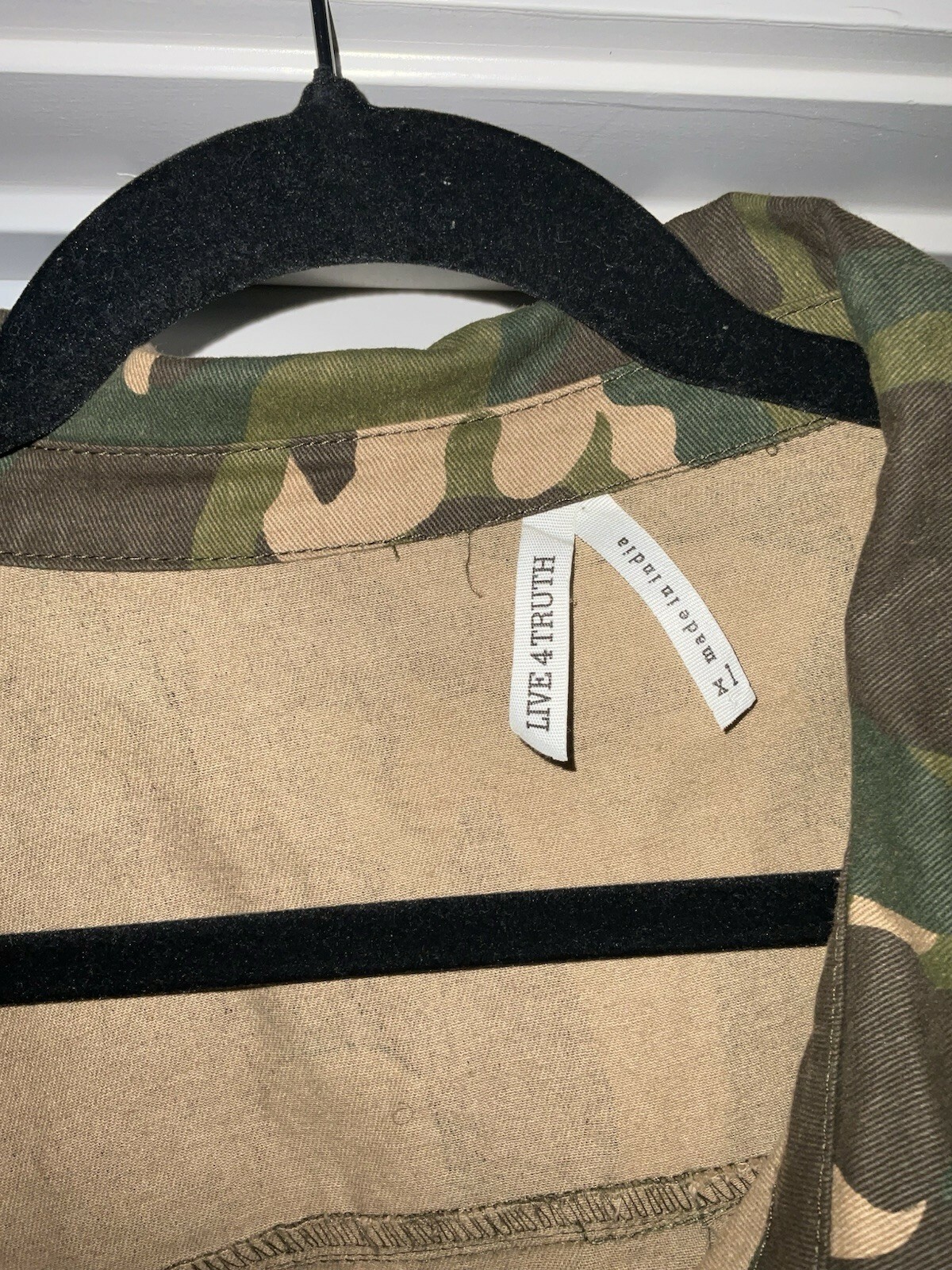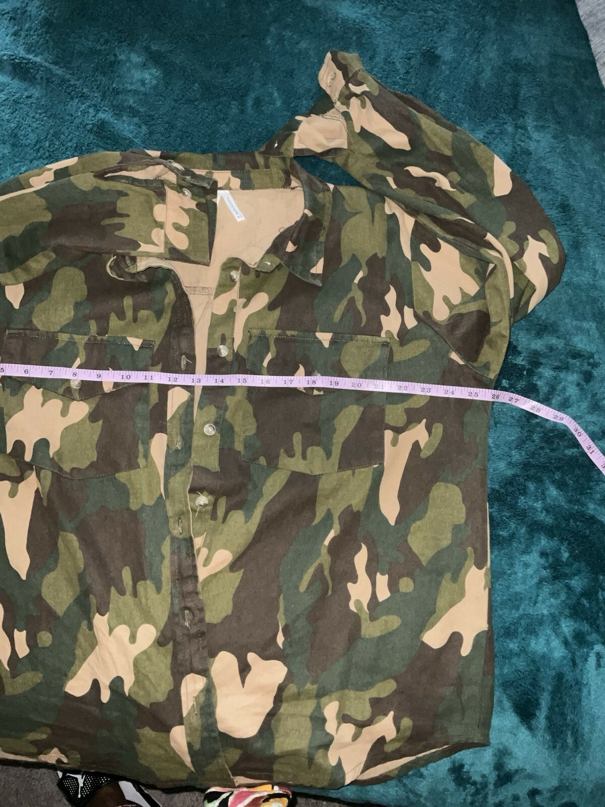 The Live 4 Truth Green 100% Army Print Button Front Long Sleeve Shirt in size XL is a stylish and comfortable top for women. With a camouflage pattern featuring a military theme, this oversized shirt is perfect for those who want to make a statement with their fashion. The long sleeves and button-up front add a touch of sophistication, making it a versatile piece that can be dressed up or down. Ideal for casual wear or as a trendy wardrobe staple, this shirt is sure to stand out in any outfit. **1 button missing**