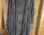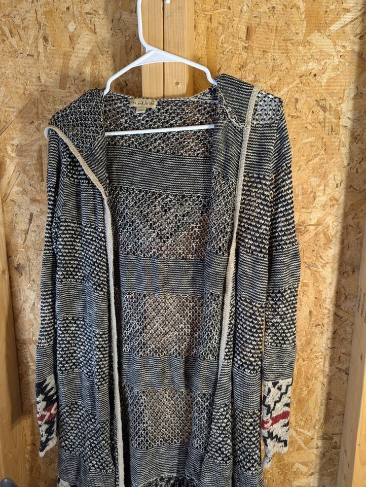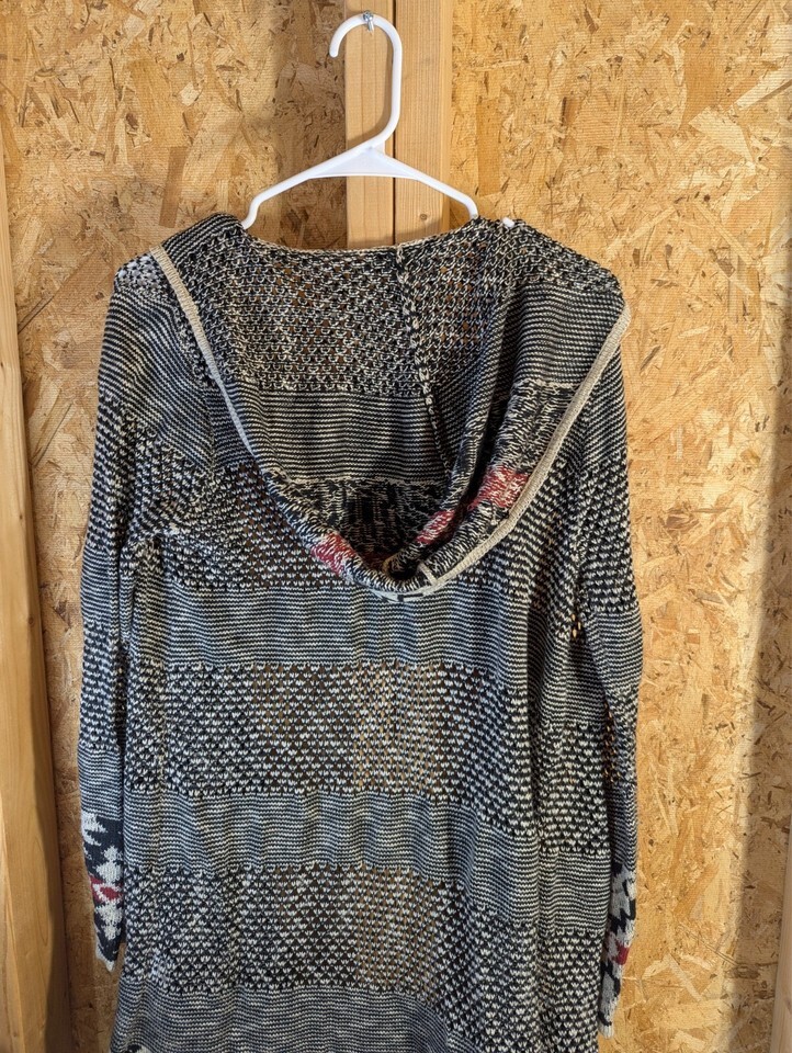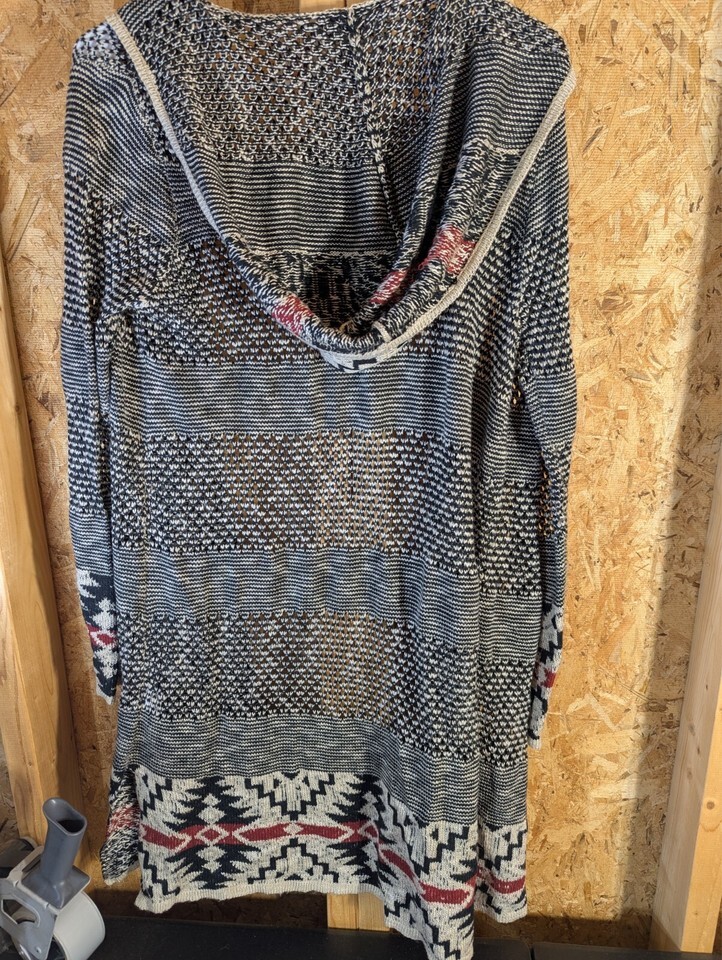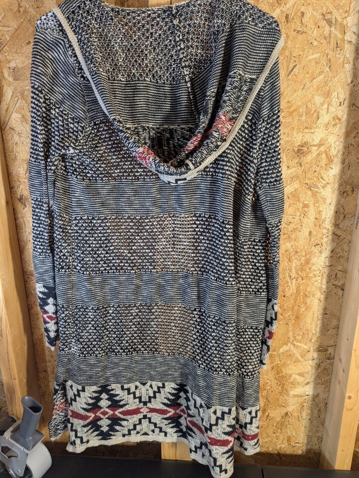 This is a large size open-knit wrap around hoodie by Live and Let Live. It features a geometric Aztec pattern in a multicolor design. Made of acrylic knit fabric, this sweater has long sleeves and is lightweight, breathable, and sheer. It is suitable for all seasons and has a hood for added style and functionality. Hand wash only.