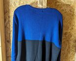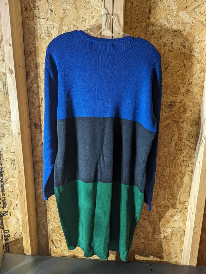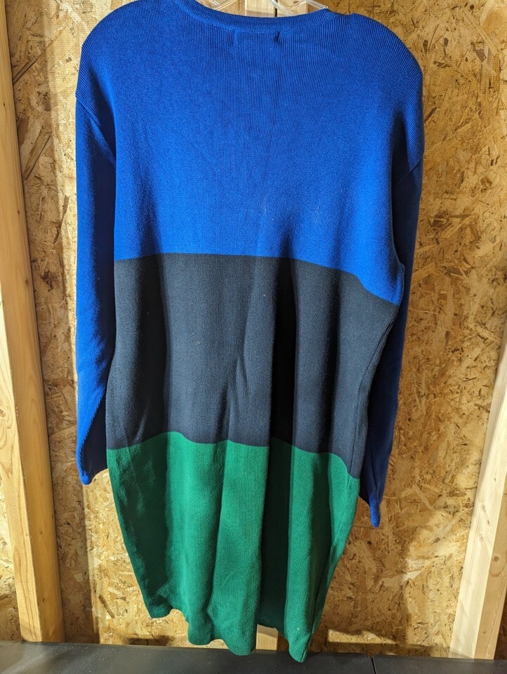 100% cotton sweater dress by Liz Claiborne with gold tone buttons on the shoulder as well as shoulder pads. Has a unique blue, black and green color block stripes.