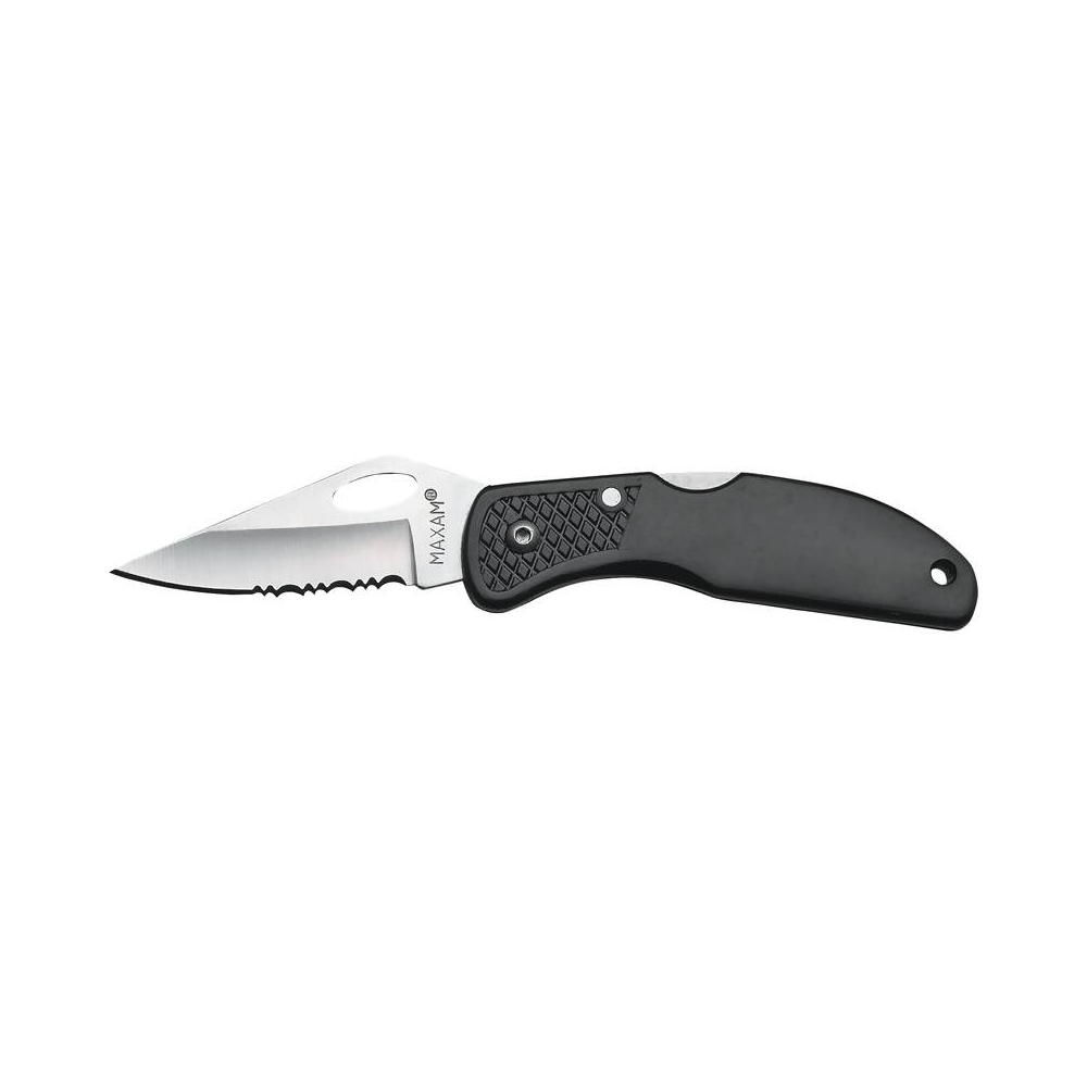 The half-serrated blade is 420 stainless steel and the handle is lightweight Leymar .
