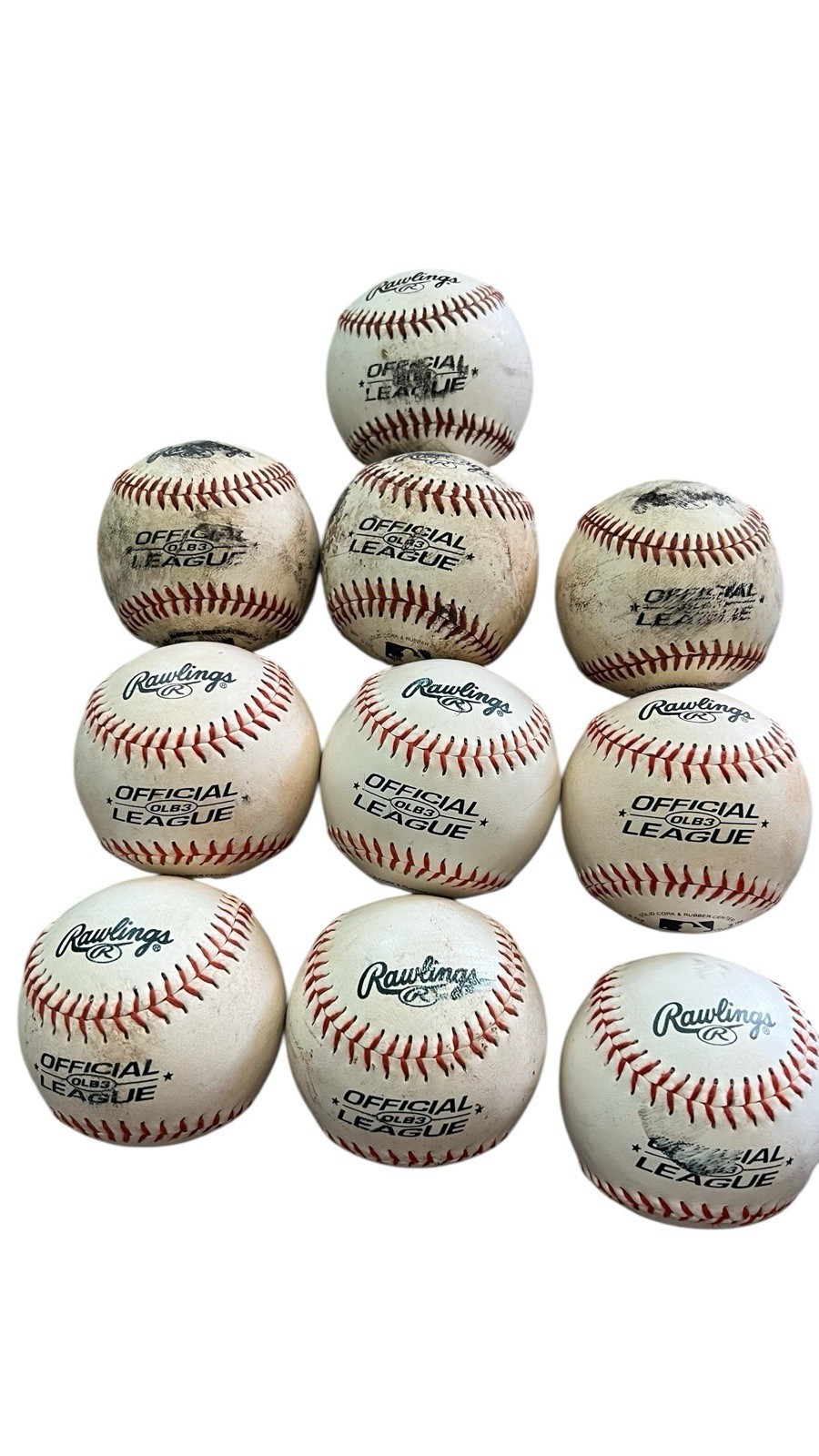 Lot of 10 synthetic league baseballs. All balls are in good used condition or new condition. Pictures show actual lot you will receive.