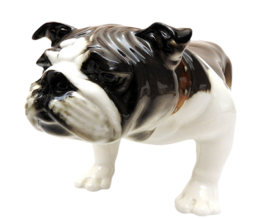 Una bellissima figurina animale in porcellana di Lomonosov artigianale di un bulldog inglese. Il bulldog e completamente realizzato dalla migliore porcellana di argilla del mondo ed e completamente realizzato a mano dalla fabbrica di San Pietroburgo, in Russia, che esiste dal 1744 durante la dinastia dello zar in Russia. Il Bulldog inglese e uno dei pezzi più belli realizzati in quanto ha anche un guinzaglio artigianale insieme a un colletto. Ha bellissimi colori di un brwon scuro insieme al colore bianco. Il pezzo e lungo 11 pollici, largo 7 3/4 ed e alto 6 pollici. Il bulldog inglese e stampato sul fondo timbrato con il marchio di Lomonosov.