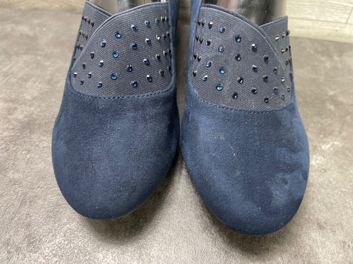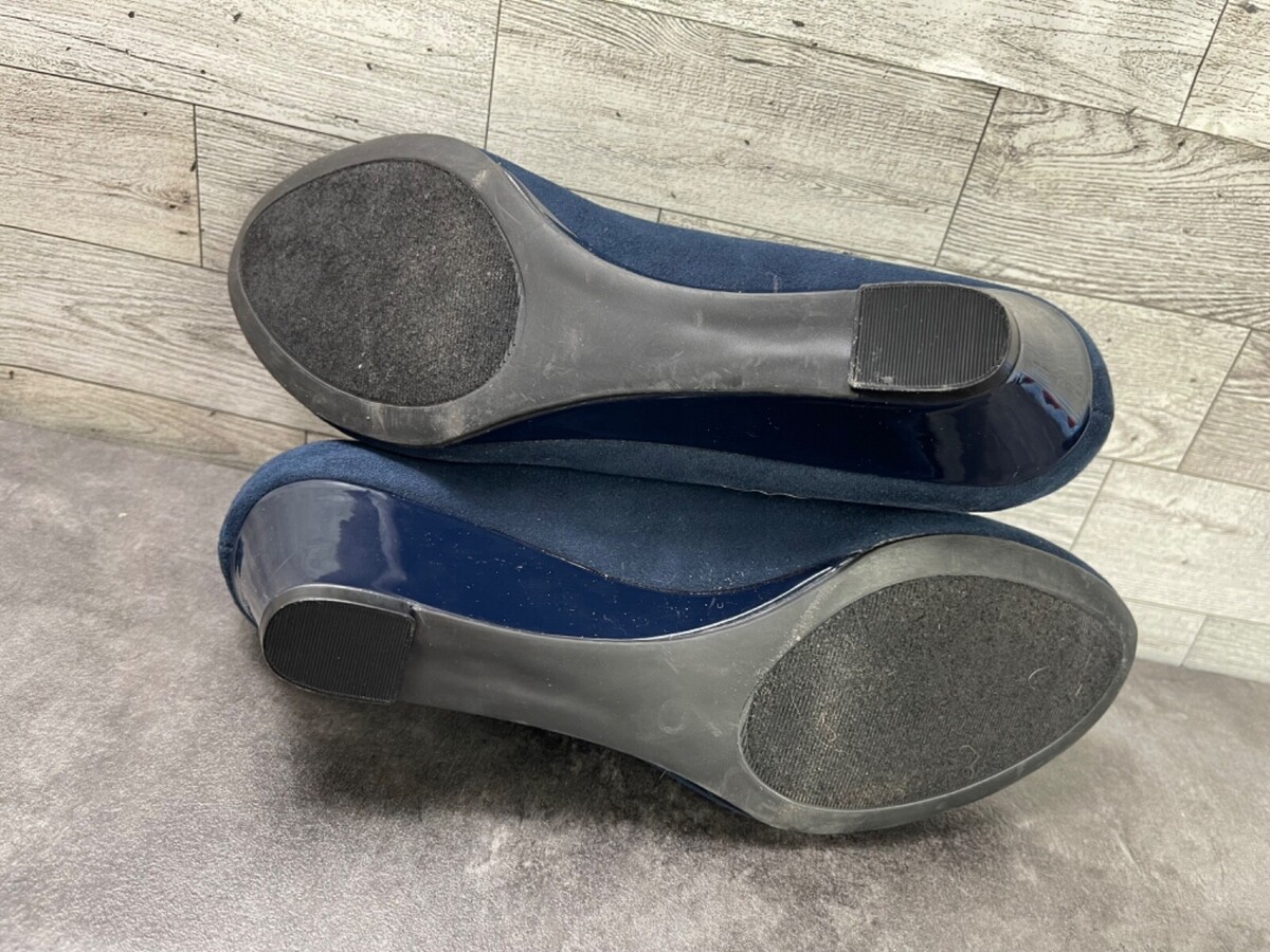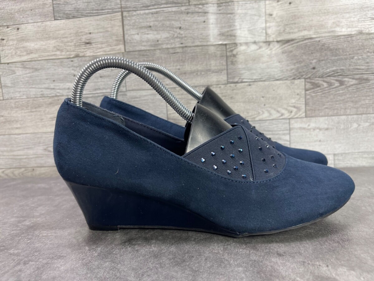 - London Fog Heels Women 9.5M Delevan Shoes Blue Suede Wedge Rhinestones Pumps