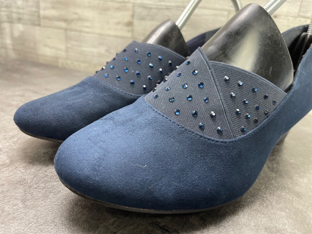 London Fog Heels Women 9.5M Delevan Shoes Blue Suede Wedge Rhinestones Pumps