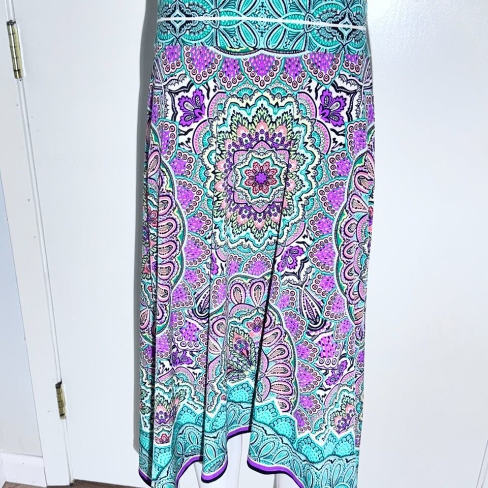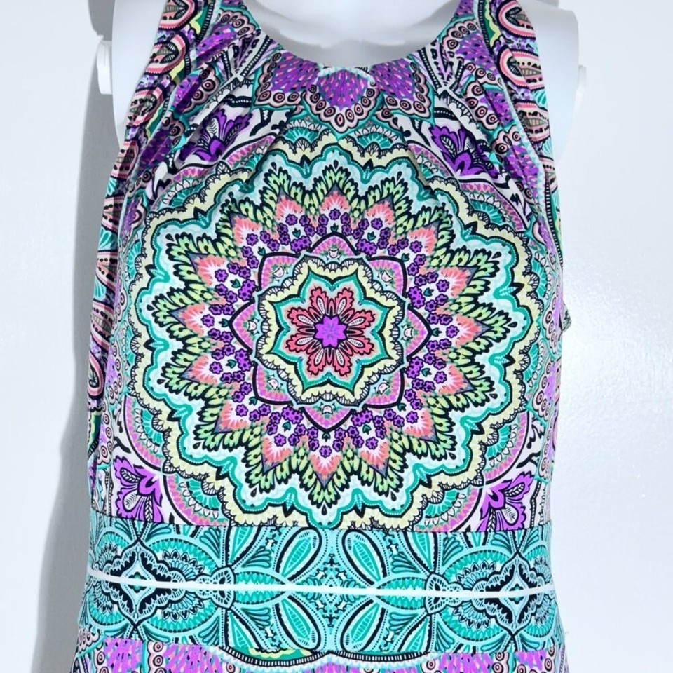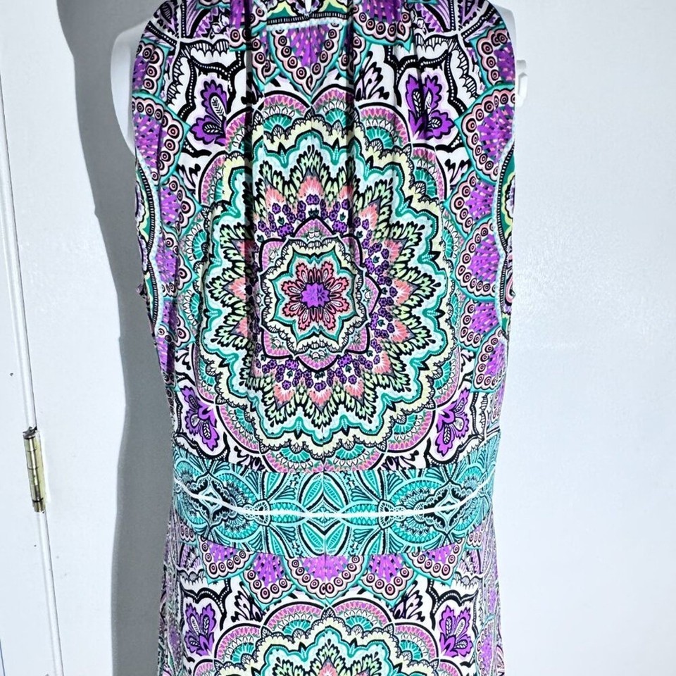Step into the spotlight with this vibrant London Times sleeveless midi dress in size 10. Featuring a stunning mandala-inspired pattern in shades of turquoise, lavender, and fuchsia, this dress is perfect for spring and summer occasions. The gathered neckline and tailored waist create a flattering silhouette, while the flowy skirt adds a playful touch.