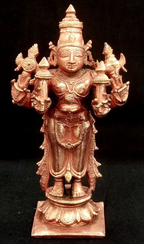 This graceful Idol made in heavy copper portrays Lord Surya Narayana crafted by artisans of south india , the idol has fine carving and sculpting . Surya Narayan is beautifully decked with jewells and adorns a beautiful crown , having four hands , his front two hands holds two lotus , and other two hands holding shankha and chakra .