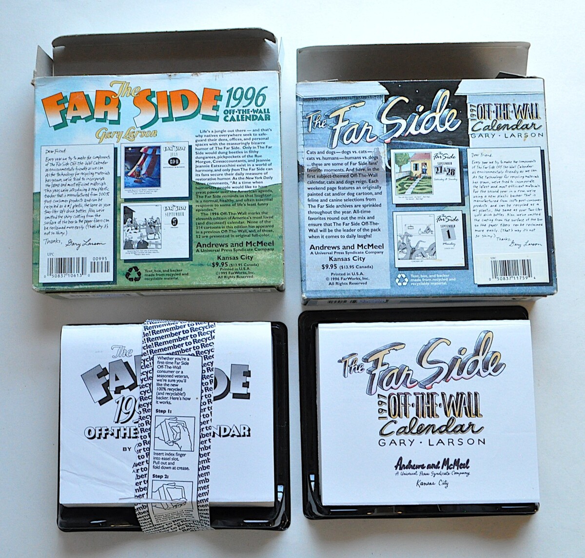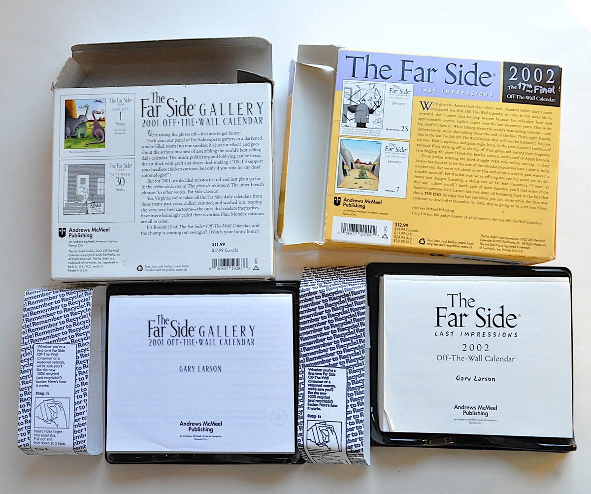 Run of nine The Far Side Off-The-Wall daily comic desk calendars, from 1991-2002 minus 1995 and 1998. Overall they are fair to good, I'd say. They do all appear to be complete. Please read my description and inspect the photos closely if condition is important to you.