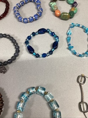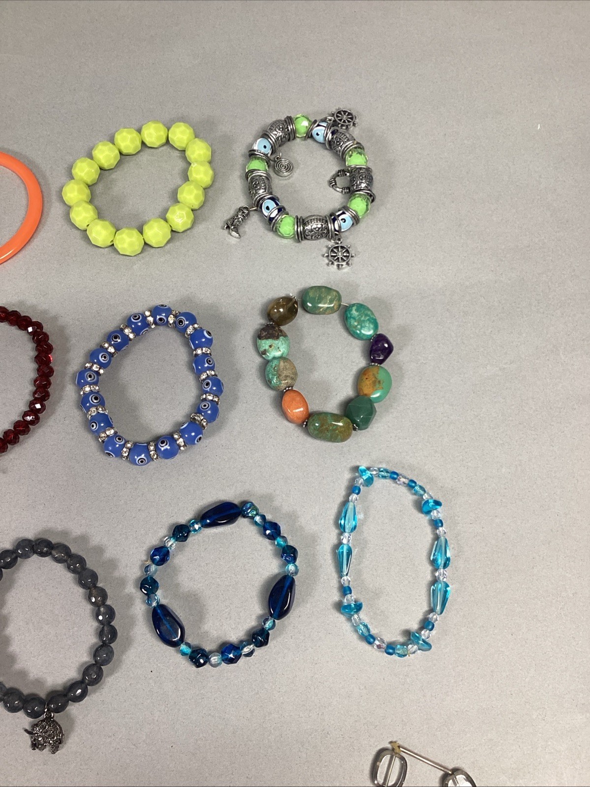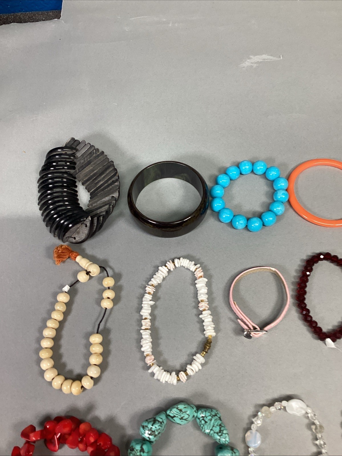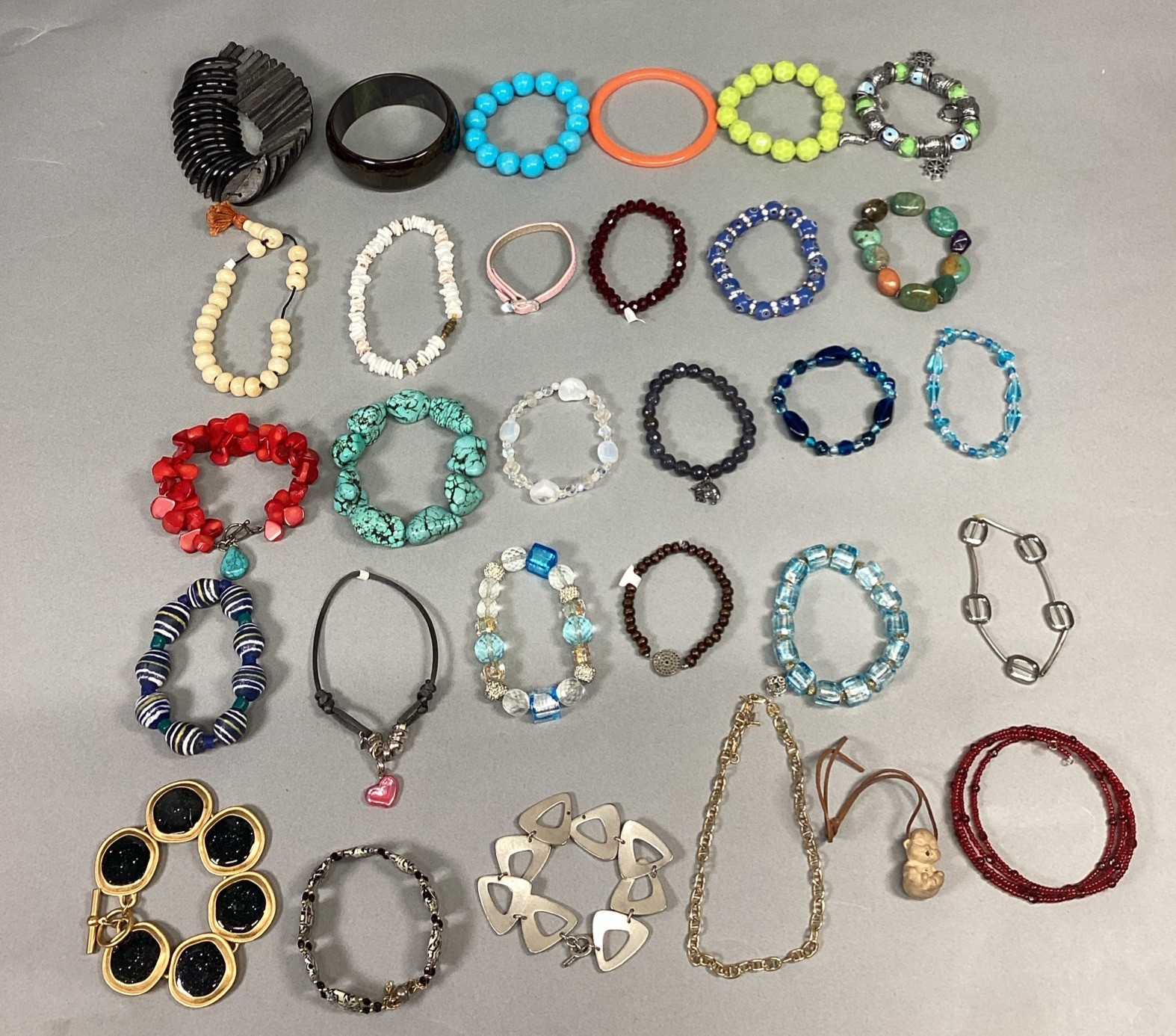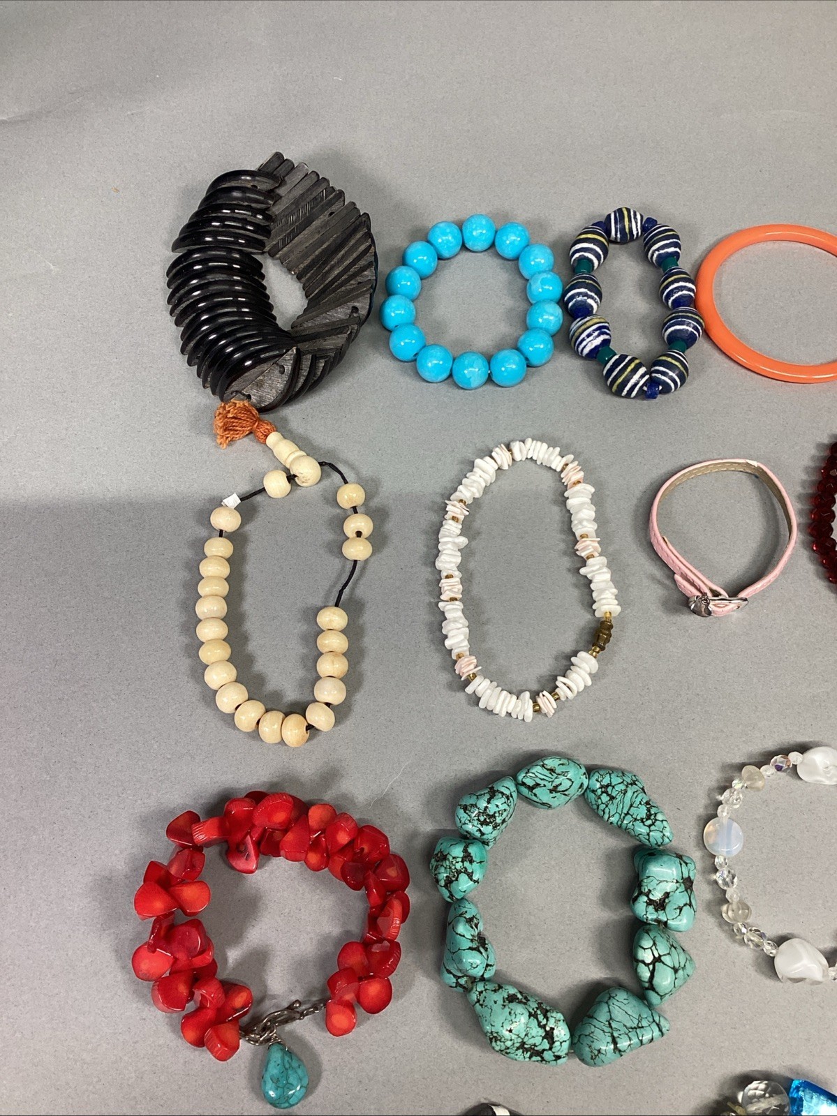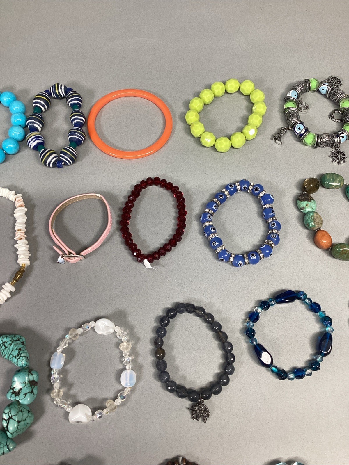 Lot Of 30 Vintage Women?s Bracelets Costume Jewelry. There are 18 stretch bracelets, 2 bangle style, 4 adjustable bracelets and 6 others. Various styles and sizes. There are 2 bracelets that are stretched out and there?s 1 that is missing a link which can be purchased at a craft store or online. The others are in good condition. 1 bracelet snapped just now but will be including it anyways. Please see the last picture.