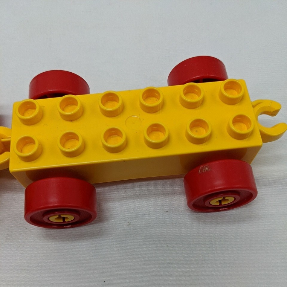 - Lot Of (4) Lego Duplo Red Yellow Train Cars With Blue Overall Conductor