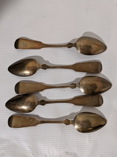 - Lot of 5 Davis Palmer & Co Boston 1838-1845 Coin Silver Tea Spoons Monogrammed