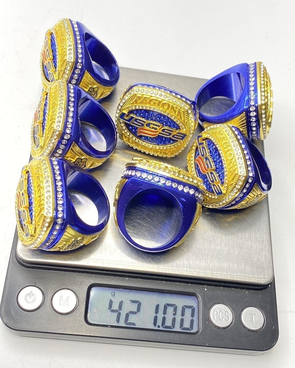 Add a bold statement to your USSSA memorabilia collection with this lot of seven (7) 2024 USSSA Regional Champion ?Points Race? rings. Each ring features a gold-tone finish with blue enamel highlights, crystal rhinestones, and intricate detailing ? including the USSSA logo and ?Regional Champion? text across the front.