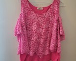 this hot pink top is still in good condition. it has a layer of sheer floral design as well as off the shoulder style. It has some light wear like a couple light pulls but still looks great! Pit to pit approx 19" length shoulder to bottom approx 25" long