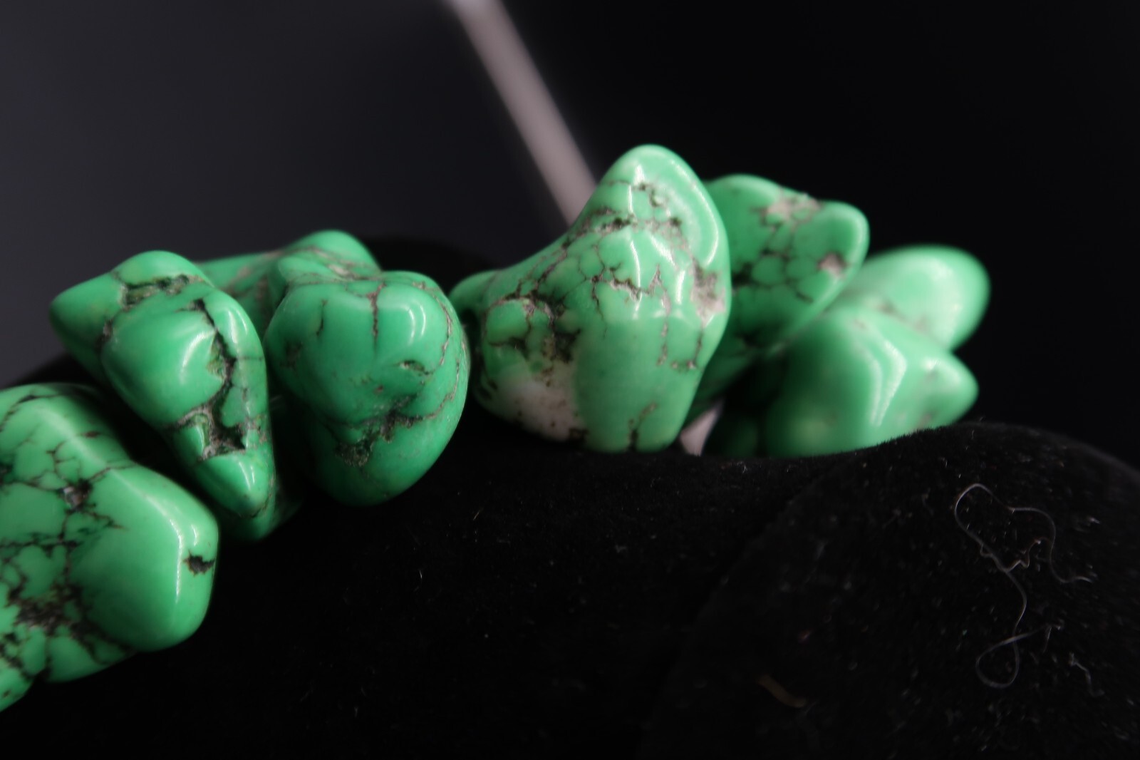 People will talk if you are wearing this necklace! Princess length. Strung on a heavy weight plastic line. Almost brutalist in it's simplicity, beautiful Turquoise stones. Heavy. Please carefully examine all pictures before purchasing. The pictures are an important part of the description, and usually include important measurements. Items are in good pre-owned condition unless otherwise noted.