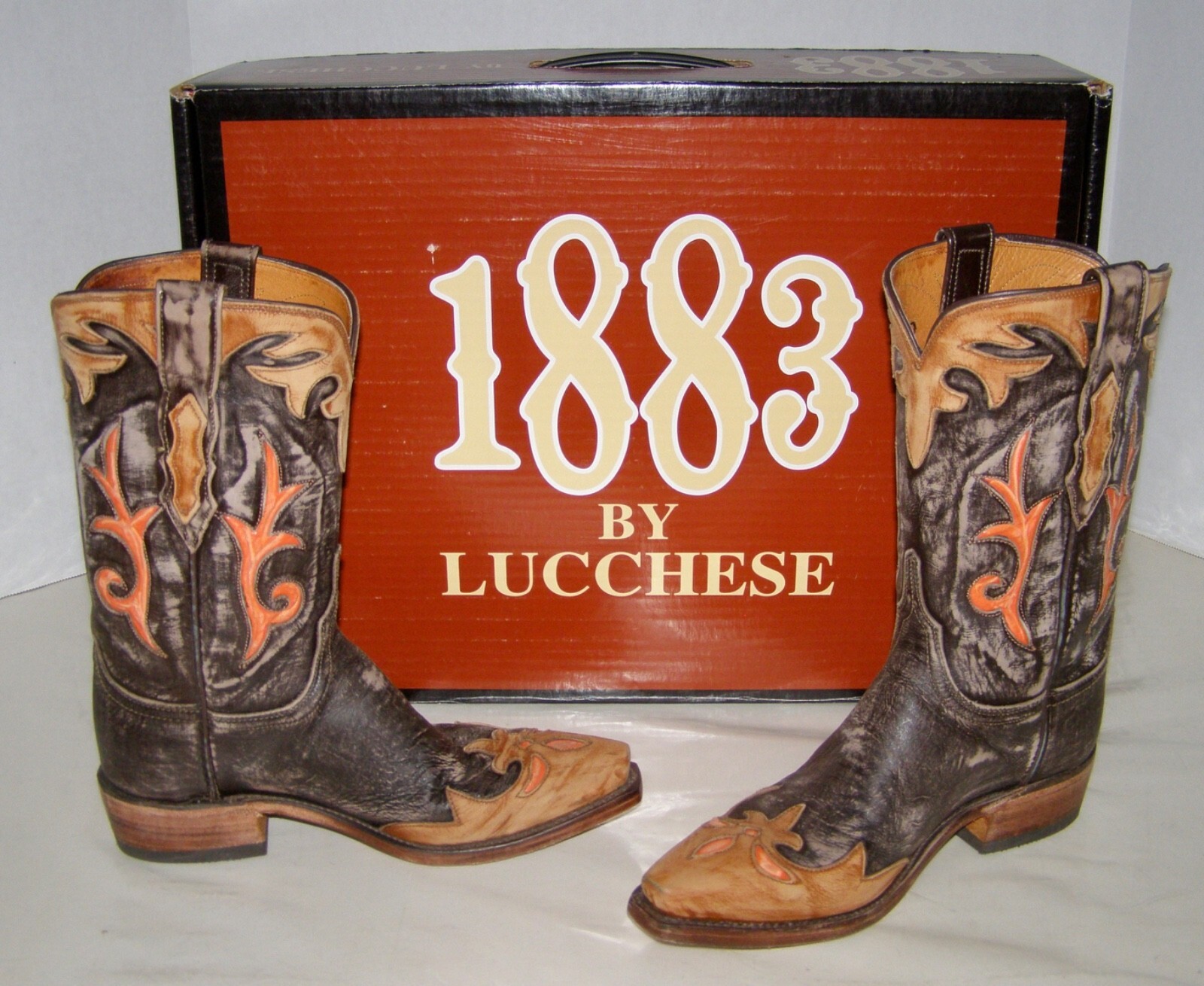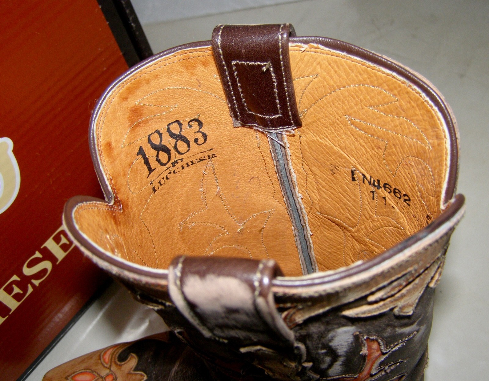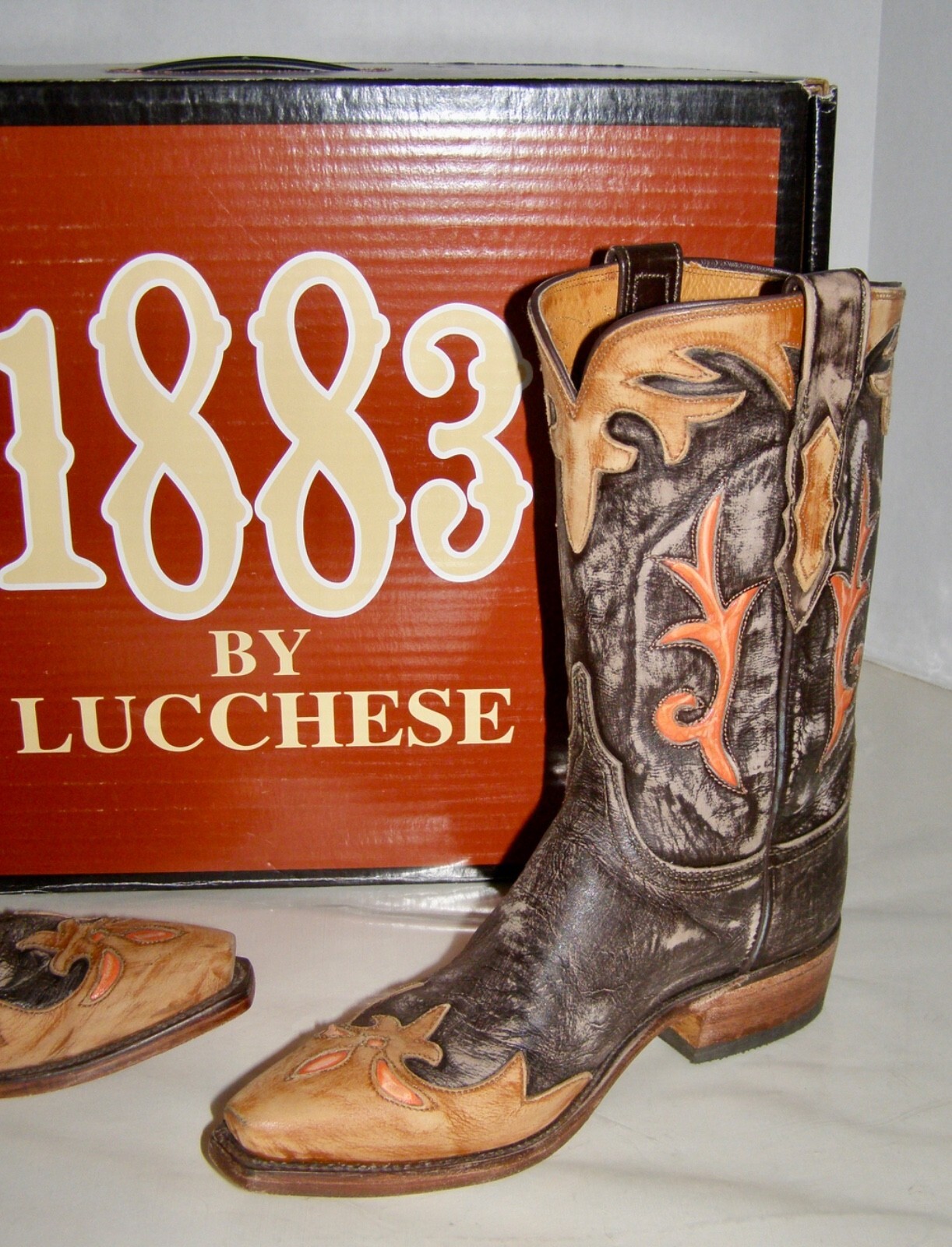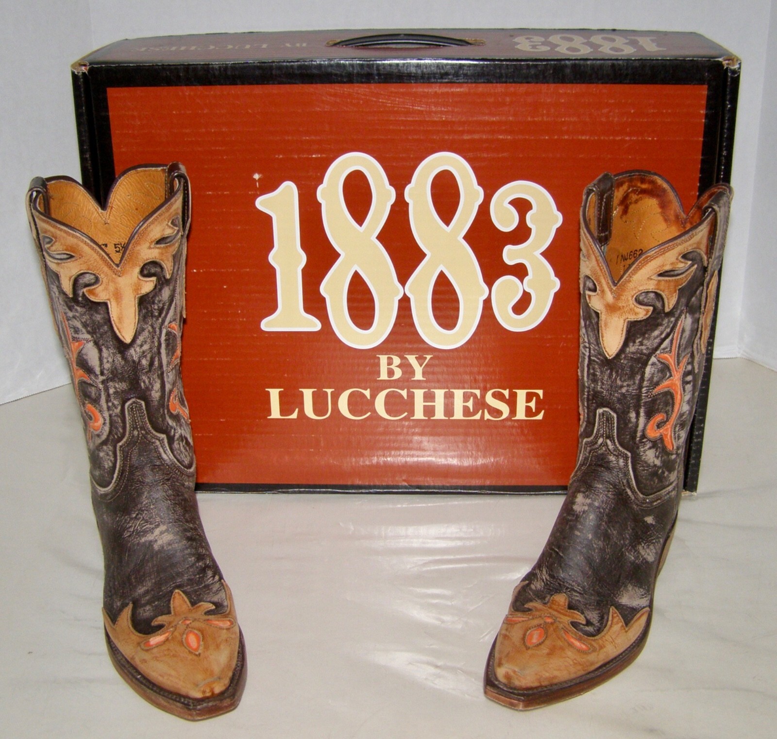 LUCCHESE 1883 HANDMADE DISTRESSED FINISH COWGIRL BOOTS-BLACK+ RED-ORANGE-S: 5.5C