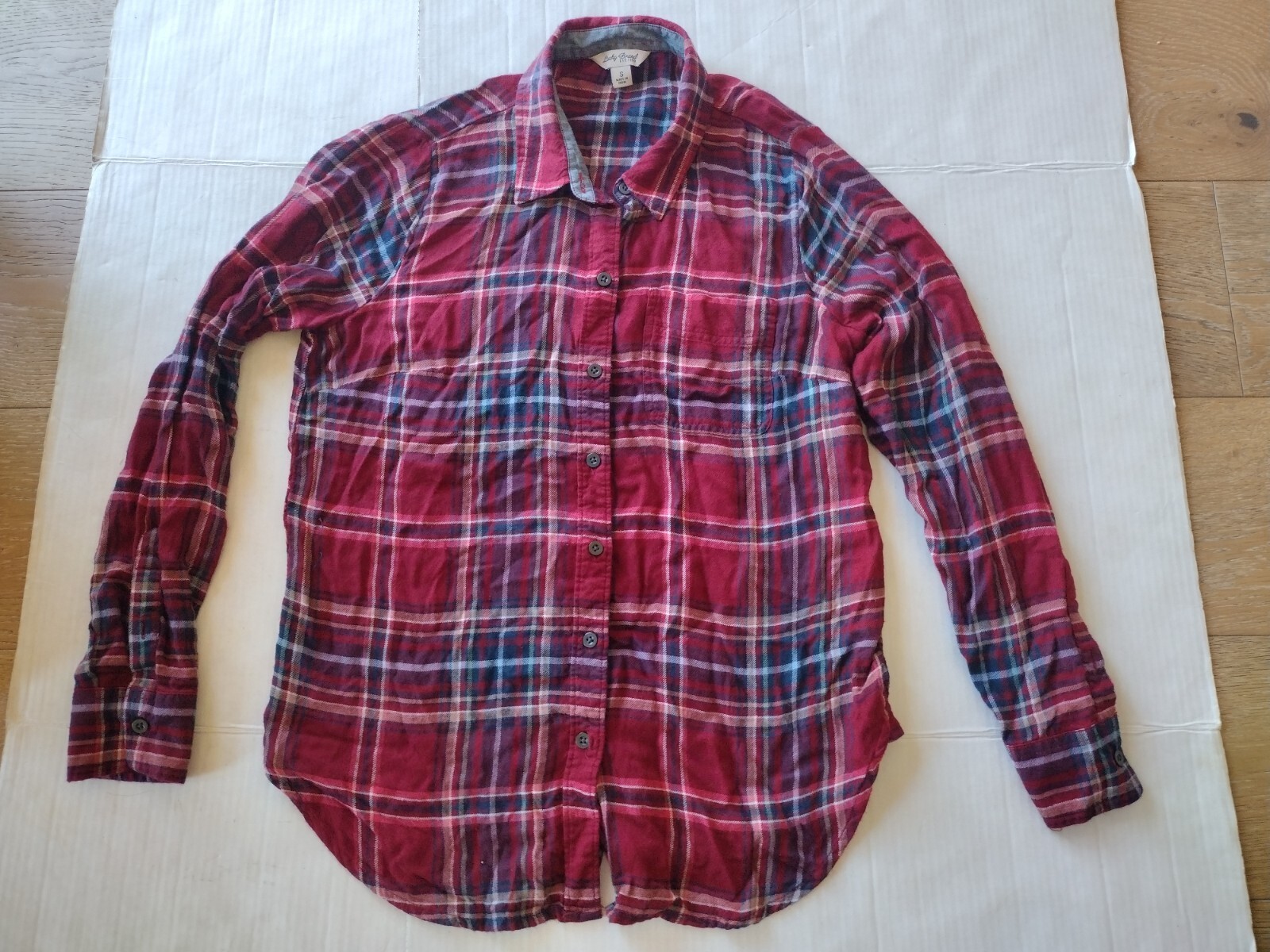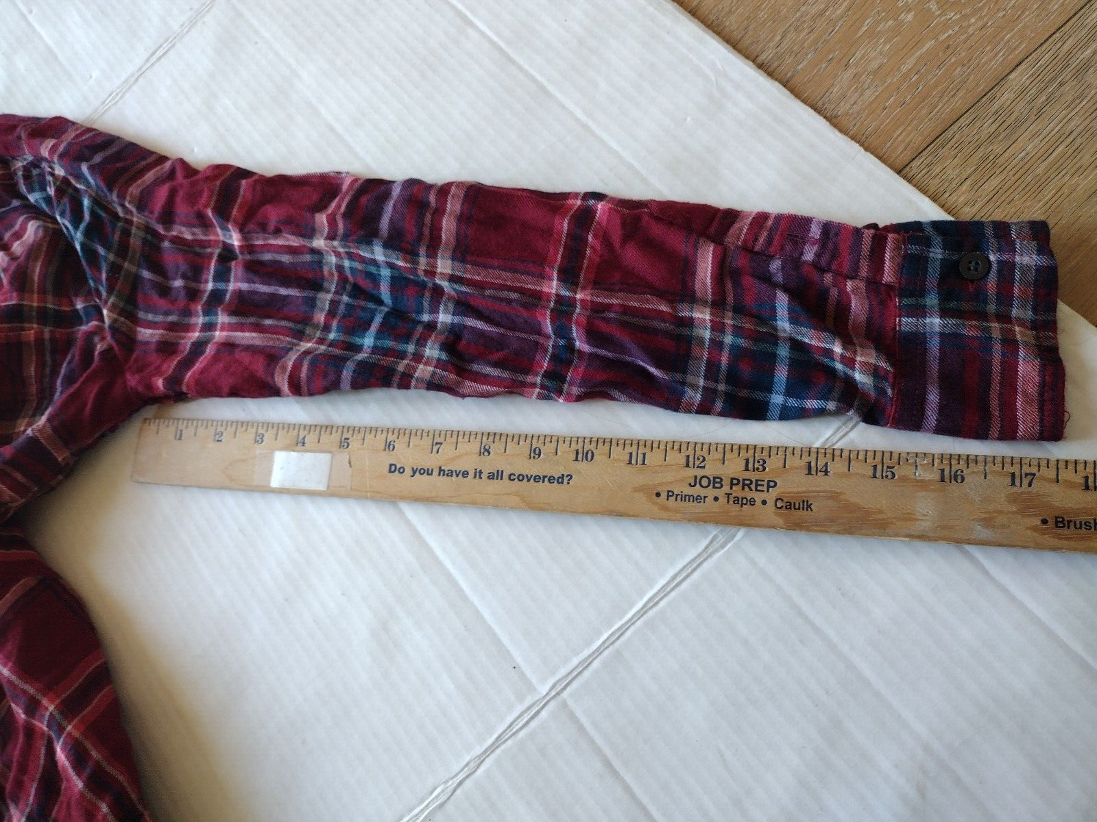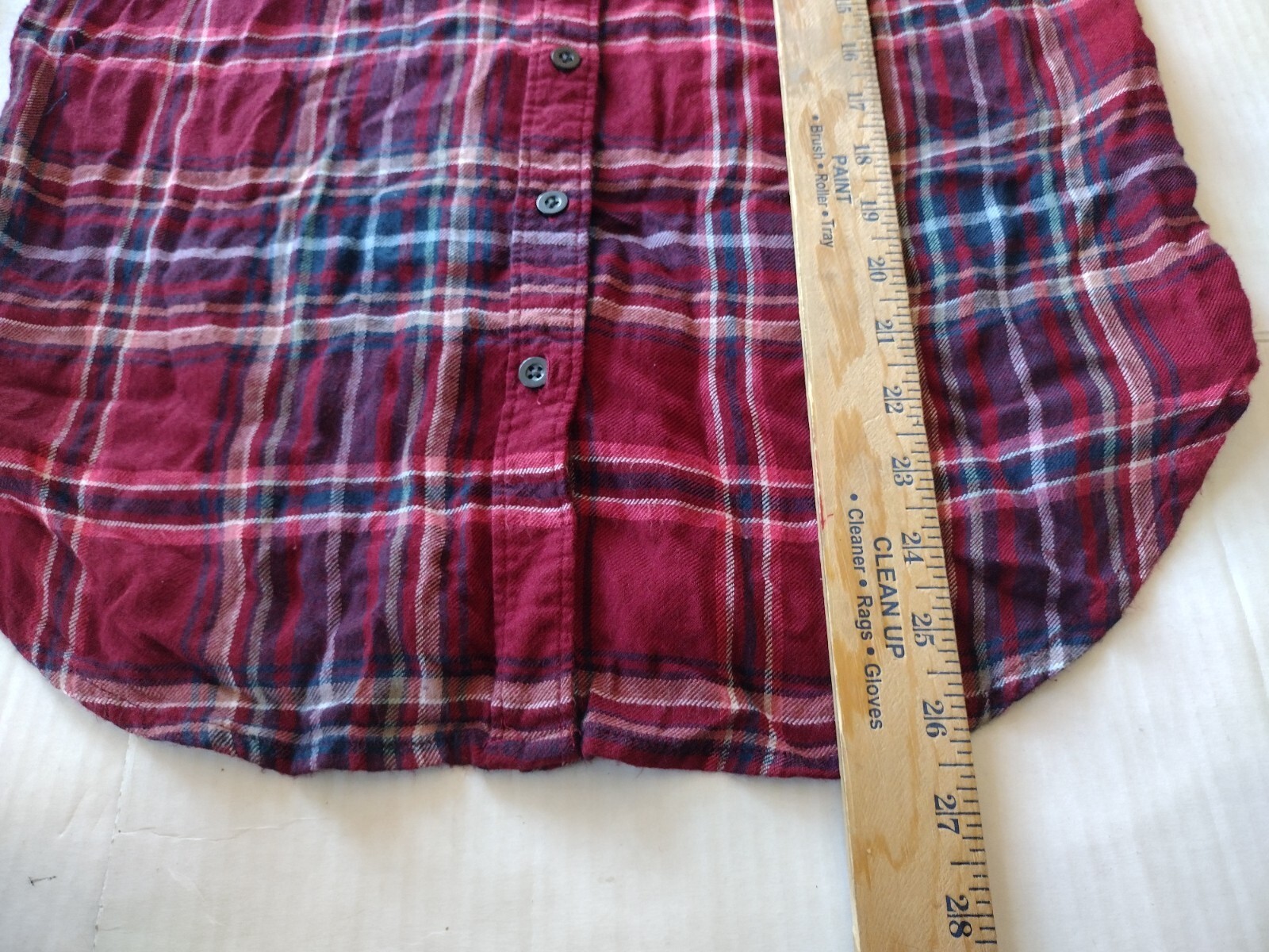 This is a women's Lucky Brand button-up shirt made of a viscose and modal knit fabric in a red plaid pattern. It features a collared neckline, long sleeves, and a regular fit. The shirt is machine washable and easy to care for, making it suitable for all seasons. It has a colorful and modern theme and is lightweight and not flannel. The shirt was made in India and is in excellent used condition in size S/P/CH. Please see photos for further details and measurements. Shipping within 2 days of payment. Thanks for shopping here.