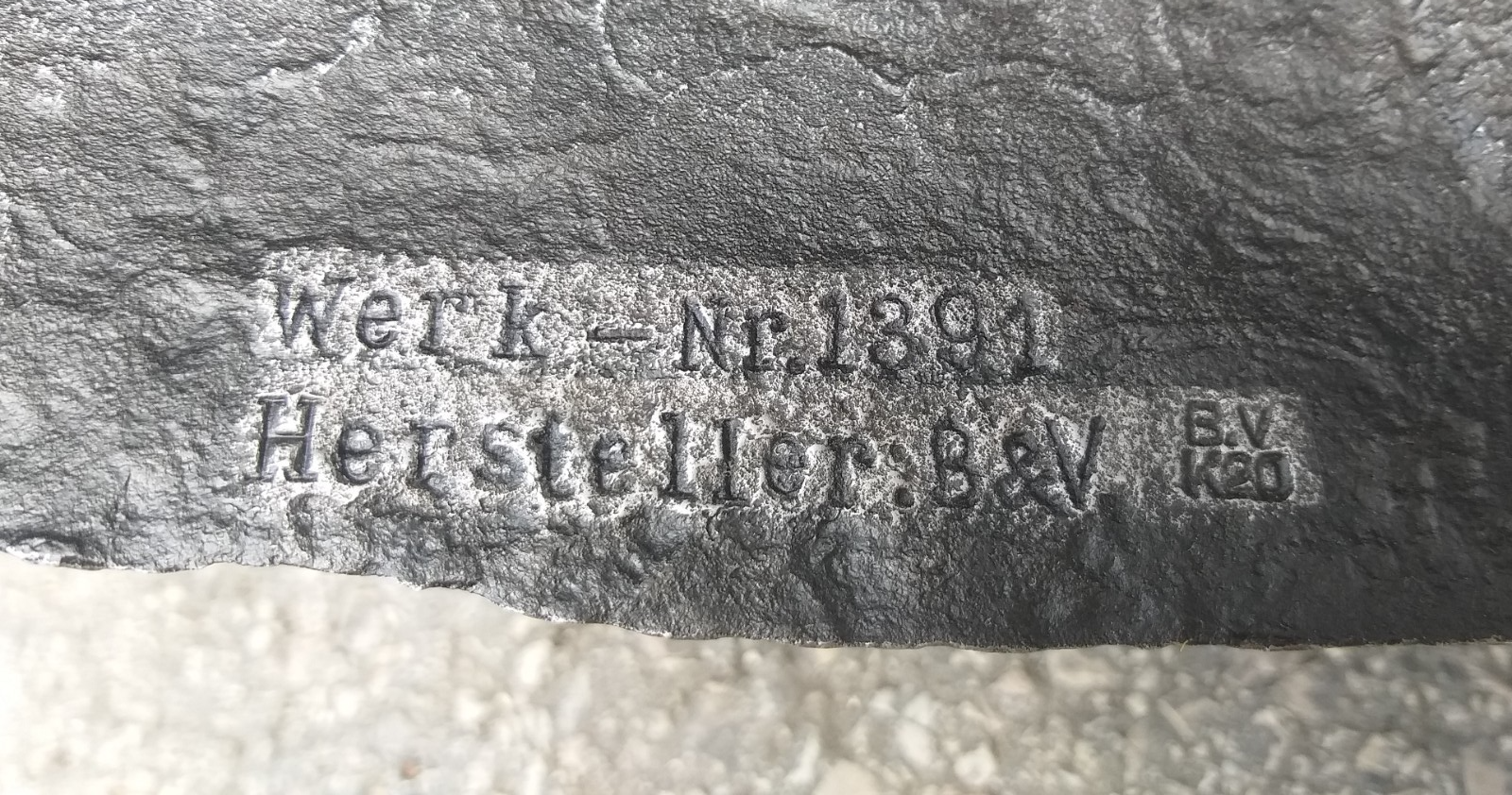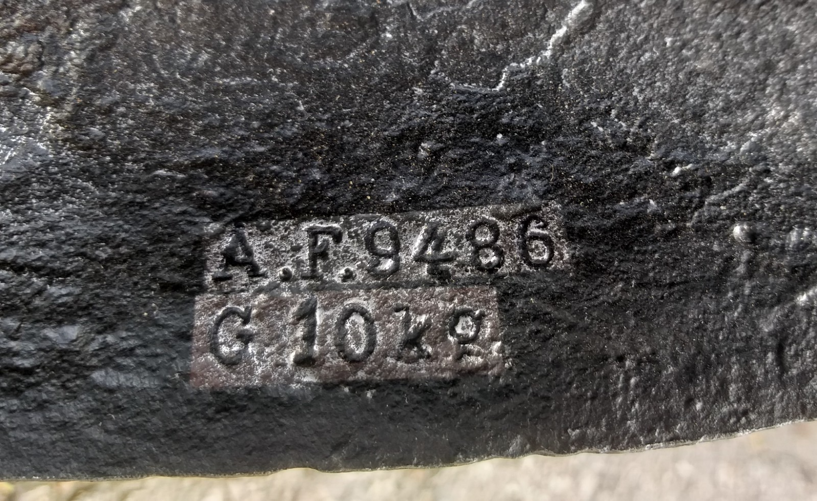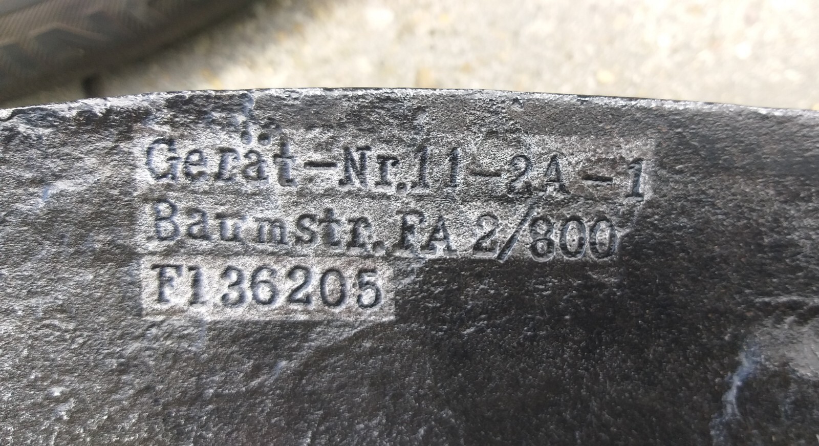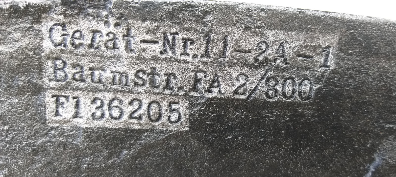 Herstellermarkierung A.F. 9486, G. 10. Kg. und Gerat - Nr. 11 - 2A - 1 Baumstr.