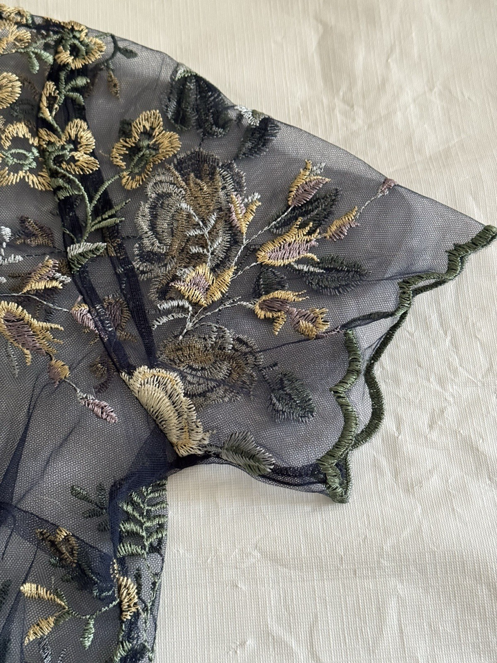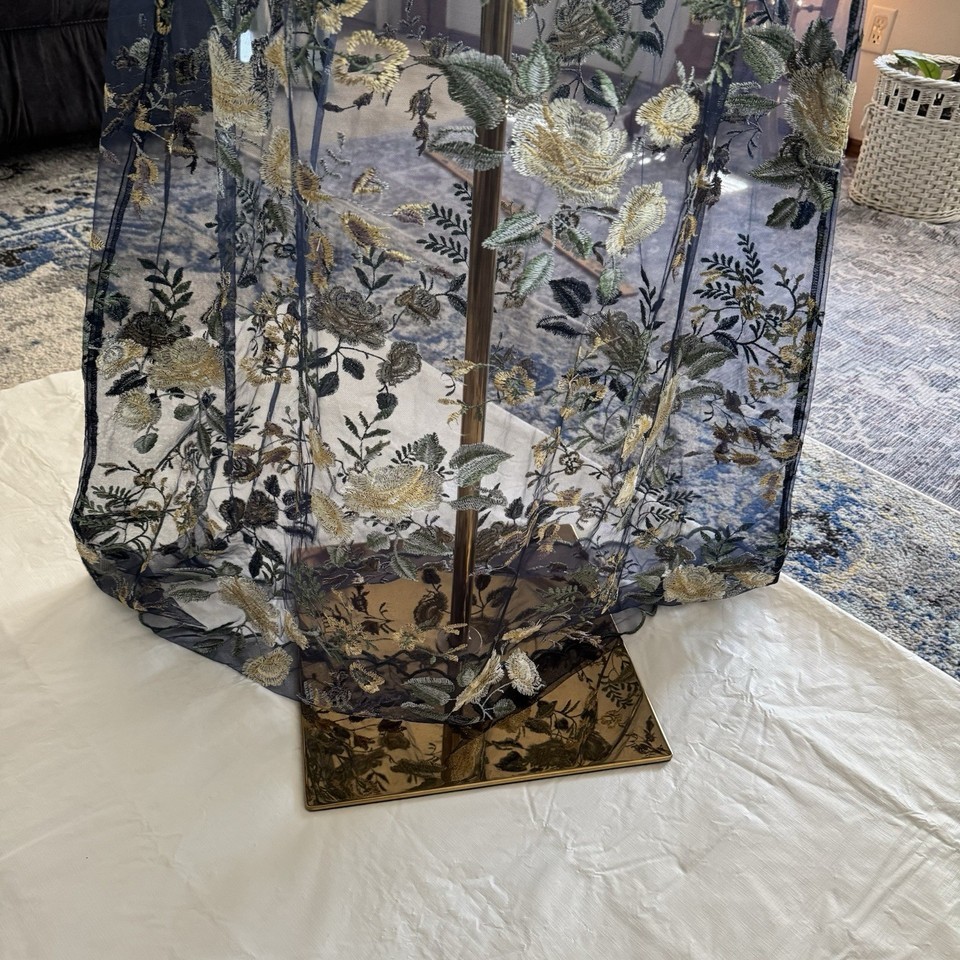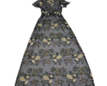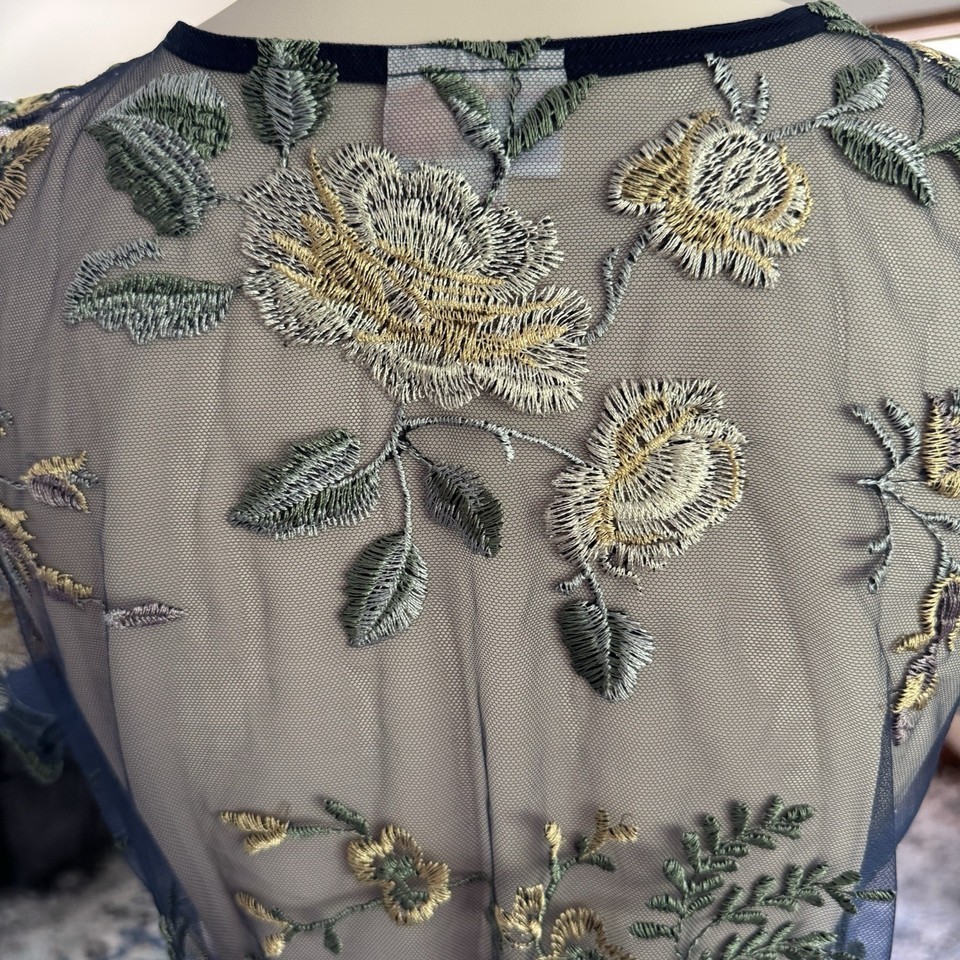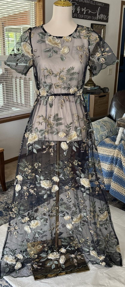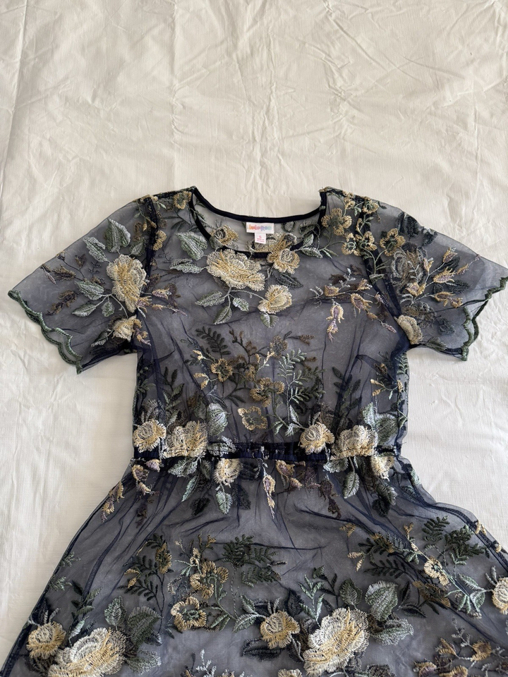 Lularoe Deanne 2 Sheer Overlay Maxi Dress Navy Blue Embroidered Yellow Flowers Size Small