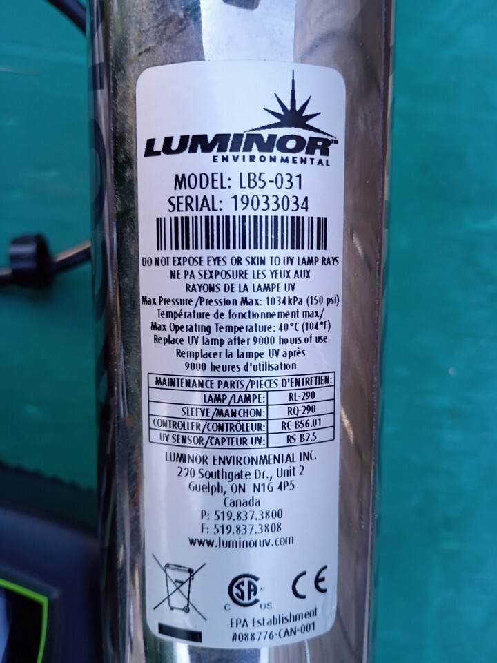 - Luminor RC-B56.01 / LB5-031 Blackcomb UVC Water Purifier 3 GPM 120VAC 1/2" MNPT