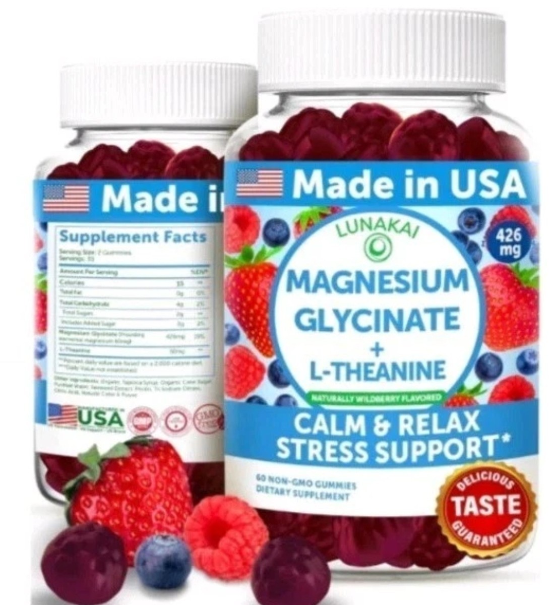 - Lunakai Magnesium Glycinate Gummies with L-Theanine USA Made Sleep Stress Relief