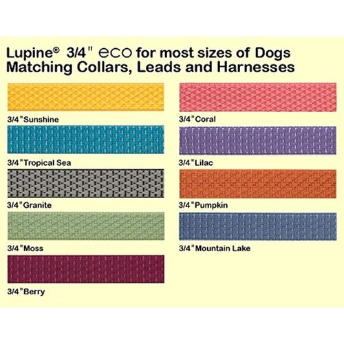 Eco by Lupine products are proudly built in Conway, New Hampshire and Guaranteed (Even if Chewed). Made from recycled plastic bottles. Bottles are melted, purified and extruded into thread. The thread is then woven to create this unique soft yet strong material with a rich texture. 3/4" wide collars are suitable for the widest range of dogs, from terriers to sporting breeds. Features strong bar-tack stitching, welded D-ring and a custom designed side-release buckle. In 9 designer colors. Matching leashes and harnesses available. To determine collar size, measure snugly around the middle of the dog's neck, then add an extra 5-percent for a comfortable fit. Machine wash, warm water, mild soap (no bleach or bleach alternative). Air dry. Lupine products are not recommended for tie-out.