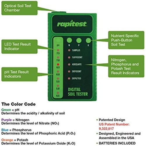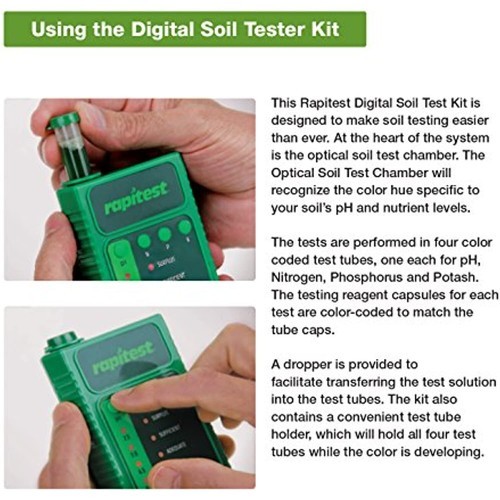 Electronic version of Luster Leaf?s popular 1601 Soil Test Kit. The rapitest Digital Soil Tester utilizes advanced LED digital technology and patent-pending optical calibration system to read test colors. The system is calibrated to read small color variations that can be difficult to distinguish with the human eye. The tester is easy to use. Just follow the easy instructions for each soil pH, nitrogen, phosphorus or potash tests; slide the test tube in optical chamber and push the appropriate button to get the test results. Once you have your soil test results, the tester booklet tells you how to adjust soil pH and provides recommendations for fertilizers. The booklet?s pH preference list allows you to select plants for your soil?s pH or know how much to adjust the soil pH for your current plants.