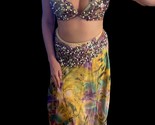 Not only is this costume a feast for the eyes, but it also embodies the spirit of celebration and artistry inherent in belly dance. The hand-sewn beads glisten brilliantly, adding an extra touch of glamour that is bound to make heads turn. With its vibrant colors and luxurious materials, this dress is not just a costume; it's an experience.