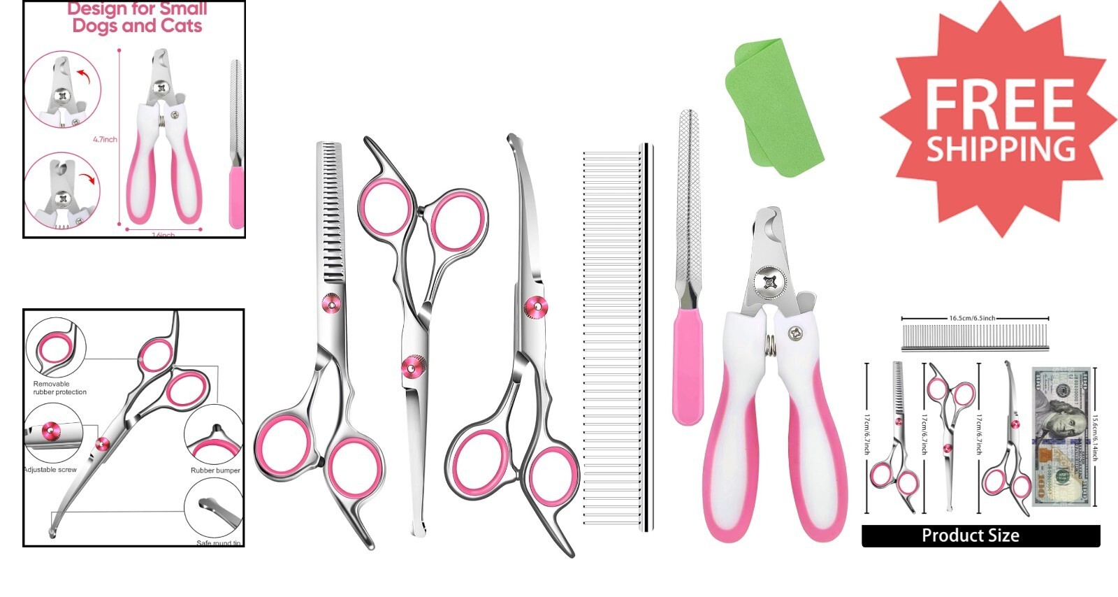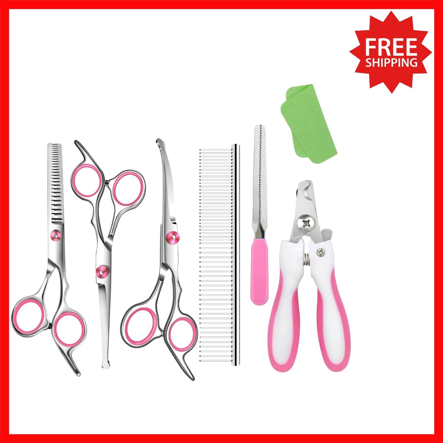 Achieve salon-quality grooming at home with our Professional Dog Grooming Scissors Kit. Engineered with rounded tip blades for safety, it ensures gentle trimming around sensitive areas like eyes, ears, and paws. The kit includes curved, straight, and thinning shears crafted from durable 6.7 stainless steel, along with a grooming comb, nail clippers, and a nail file?perfect for all coat types and grooming needs. Adjustable tension and noise-reduction features make grooming stress-free for your pet, while its versatile design suits breeds like Poodles, Terriers, Bichons, and more. Safe for cats, rabbits, and puppies, this comprehensive kit combines safety, precision, and comfort for a seamless grooming experience at home.
