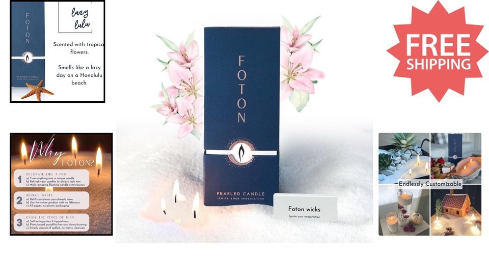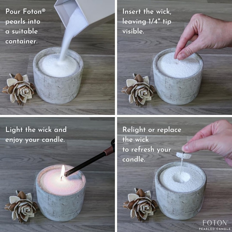 Discover endless creative possibilities with the Foton Pearled Candle Kit. Transform any suitable container into a stunning, custom candle by pouring in our pearls, complemented by a generous pack of 30 candle wicks for versatile crafting. Crafted from natural, unscented ingredients, these eco-conscious candles provide a clean, minimalist flame that?s gentle on your senses and the environment. Enjoy a longer burn time of up to 120 hours, with the unique ability to reshape and refresh your candle using our special sand powder, making each lighting a new experience. Designed for the mindful consumer, our non-toxic, plant-based candles deliver a beautiful, eco-friendly glow. Decorate like a pro and reduce waste with patent-pending candle pearls?perfect for personalization and seasonal styling.