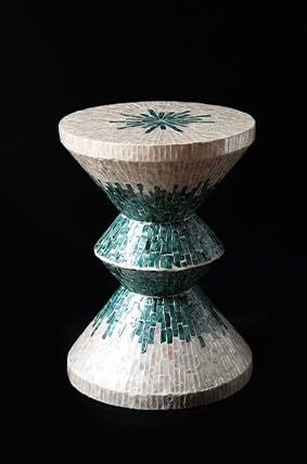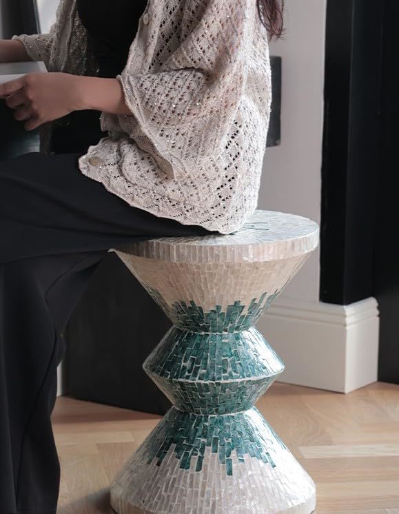 Product description: Elevate your living space with this exquisite shell mosaic garden stool from Interoknack. Showcasing a mesmerizing turquoise green mother-of-pearl mosaic pattern that dances with light, this versatile piece stands 19.3 inches tall with a 13.8-inch width. The traditional Asian-inspired ceramic construction meets contemporary design in this stunning accent piece. Its hourglass silhouette serves multiple functions - use it as a sophisticated side table, extra seating, or an artistic plant stand. The intricate shell work creates a shimmering effect reminiscent of tropical waters, making it a perfect statement piece for both indoor spaces and covered outdoor areas. The durable ceramic base ensures stability, while the detailed mother-of-pearl inlay adds a touch of luxury to any room. This distinctive piece seamlessly integrates into modern, tropical, or coastal decor themes, offering both practical functionality and artistic beauty.