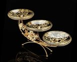 Transform your entertaining space with this exquisite Three-Tier Fruit Plate, a stunning combination of functionality and elegance. Featuring three intricately patterned round glass trays, each measuring 7.5 inches in diameter, set upon a sculptural gold-metal frame adorned with detailed floral and butterfly reliefs. Standing at 20.9 inches tall with a width of 7.5 inches and height of 10.6 inches, this decorative stand creates a luxurious focal point for any gathering. The delicately etched floral motifs on each glass tray are complemented by refined gold edging, bringing a touch of European palace-inspired style to your home. Perfect for displaying fruits, desserts, or appetizers in living rooms, at parties, or in hospitality settings. The sturdy gold metal supports ensure stability while the high-gloss finish adds a premium decorative impact, making this piece both a practical serving solution and an artistic statement for your interior design.