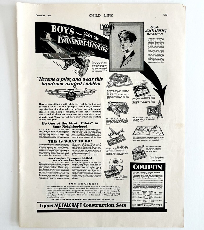 - Lyons Metalcraft Club Aero Toys 1929 Advertisement WW1 Capt Jack Bursey DWCC14