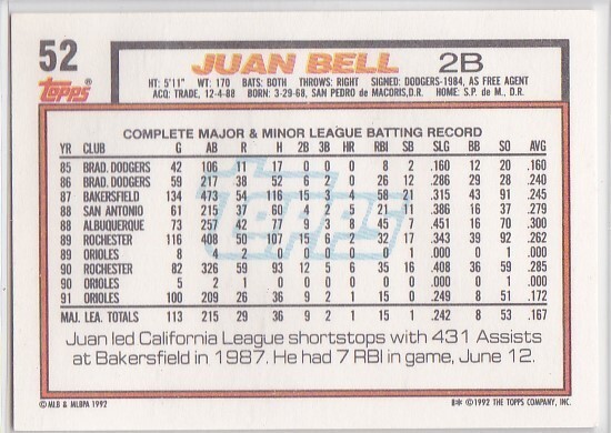- M) 1992 Topps Baseball Trading Card - Juan Bell #52