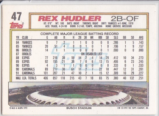 - M) 1992 Topps Baseball Trading Card - Rex Hudler #47