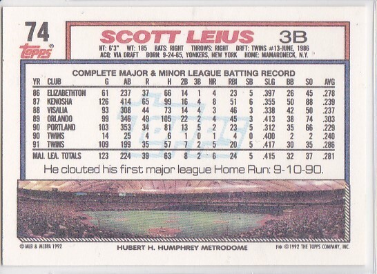 - M) 1992 Topps Baseball Trading Card - Scott Leius #74