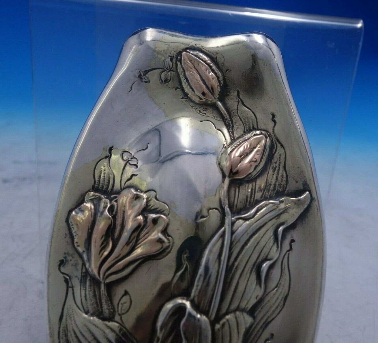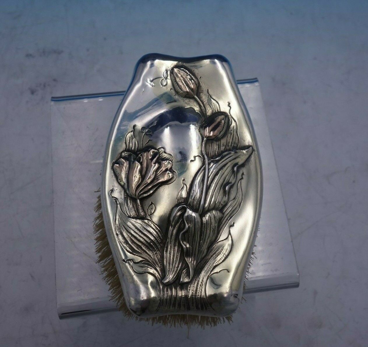 Lovely M.W. Galt and Bro mixed metals clothes brush with applied 14k gold flowers marked #203X. This piece measures 3" tall x 4 3/4". It is in good vintage condition as shown in the photo. Pretty piece!