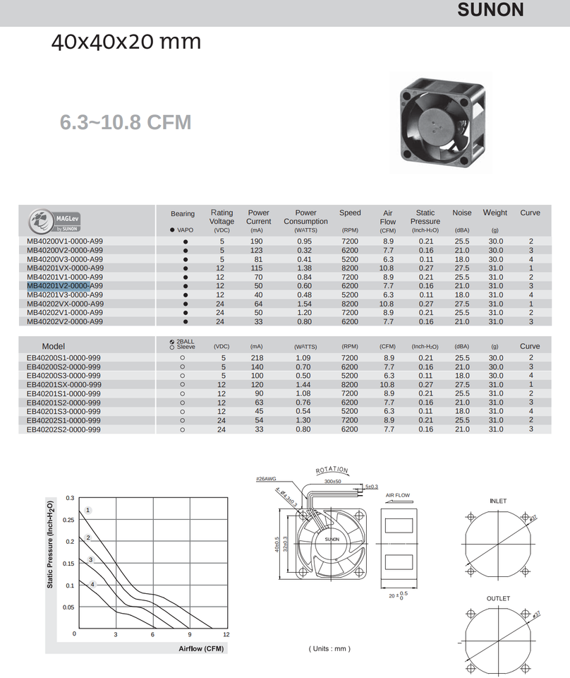 - MB40201V2-0000-G99 SUNON MagLev 40x40x20mm Fan DC 12V Auto Restart Medium Speed