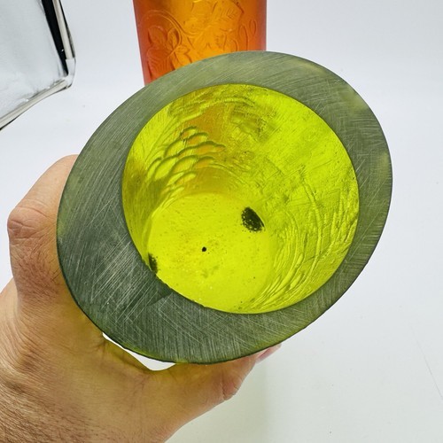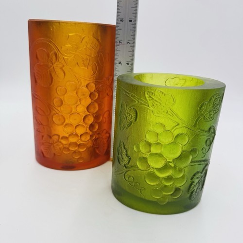 - MCM Sascha Brastoff Candle Holder Vase Signed Green Amber Embossed Fruit