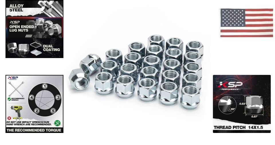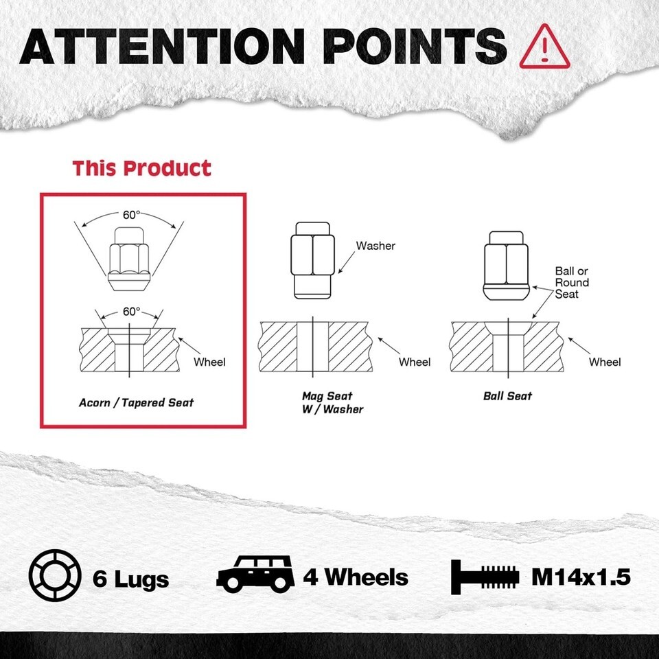 Enjoy peace of mind with our 30-DAY REFUND and 12- FREE REPLACEMENT PARTS service. Each package includes 24 pieces of zinc open end bulge acorn lug nuts.