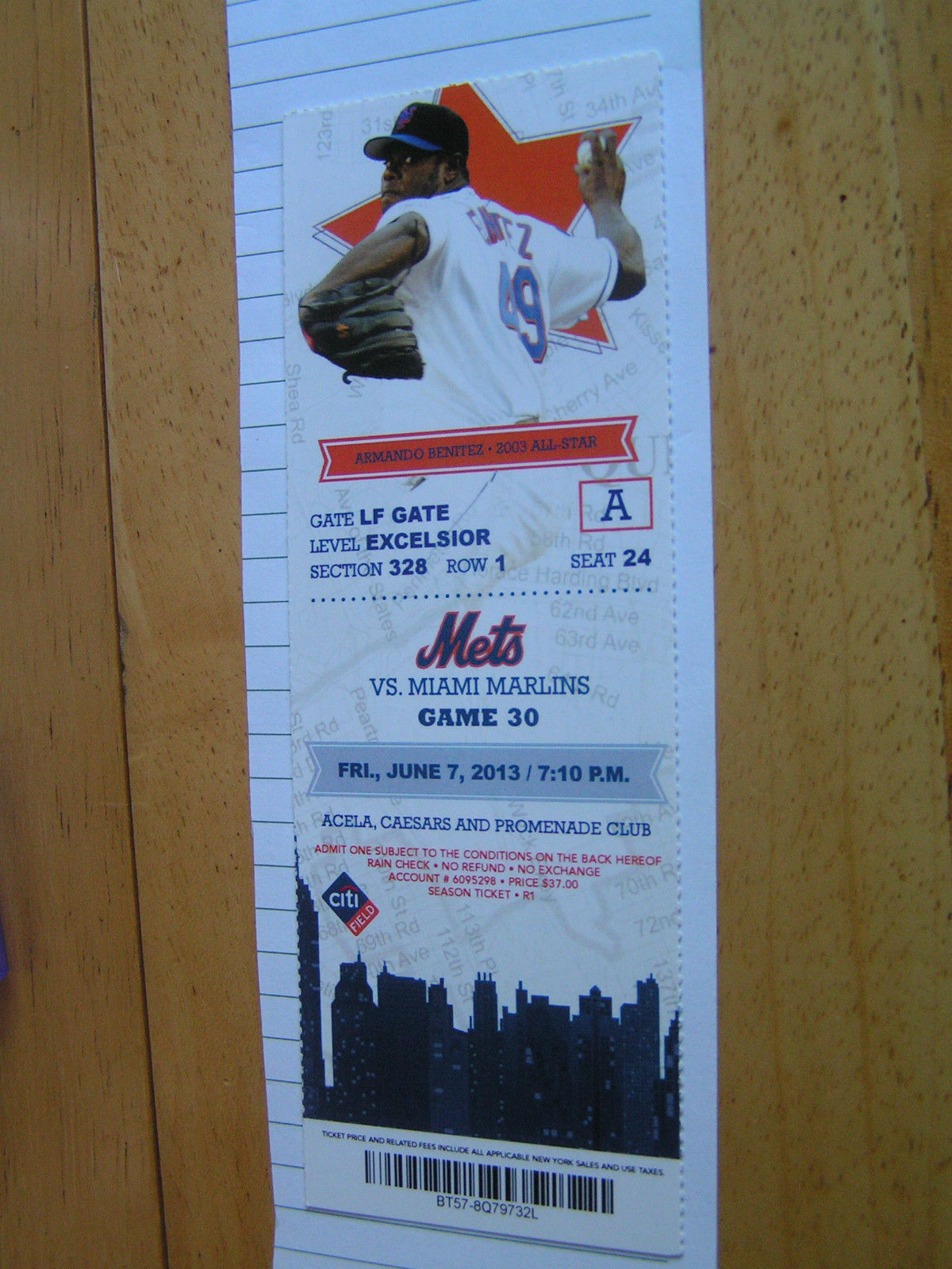 - MLB New York Mets Full Ticket Stub 6/7/13 Vs. Miami Marlins Armando Benitez